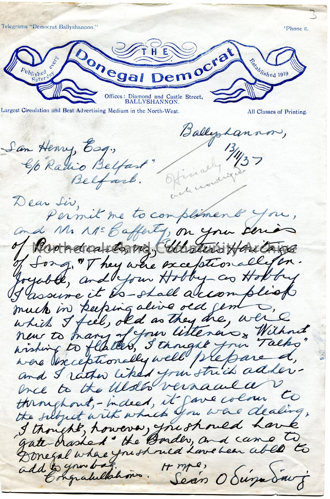 Handwritten letter to Sam Henry, c/o "Radio Belfast", Belfast. Written on headed paper. Number '3' written at top corner in pencil. 'Officially Acknowledged' handwritten in pencil top of page. Gives high praise of the broadcasts re 'Ulster's Heritage of Song.' Tells Sam he should have 'gate crashed the Border and came to Donegal.'