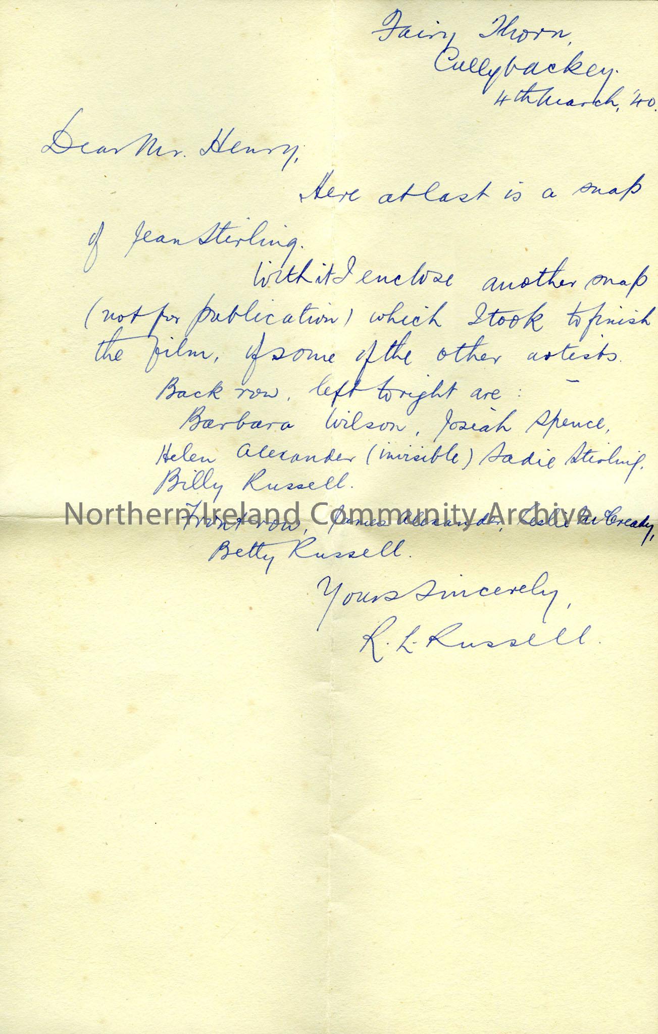 Handwritten letter to Sam Henry. Dated 4th March, 1940. Writes re photographs he took of the pupils who had completed the linocuts for Sam Henry's book 'A Hank of Yarns'. Enclosed a photograph of Jean Stirling as well as a group photograph of all the pupils. Those in the image, back row, left to right- Barbara Wilson, Josiah Spence, Helen Alexander (invisible), Sadie Stirling, Billy Russell. Front row- James Alexander, Leslie McCready, Betty Russell.