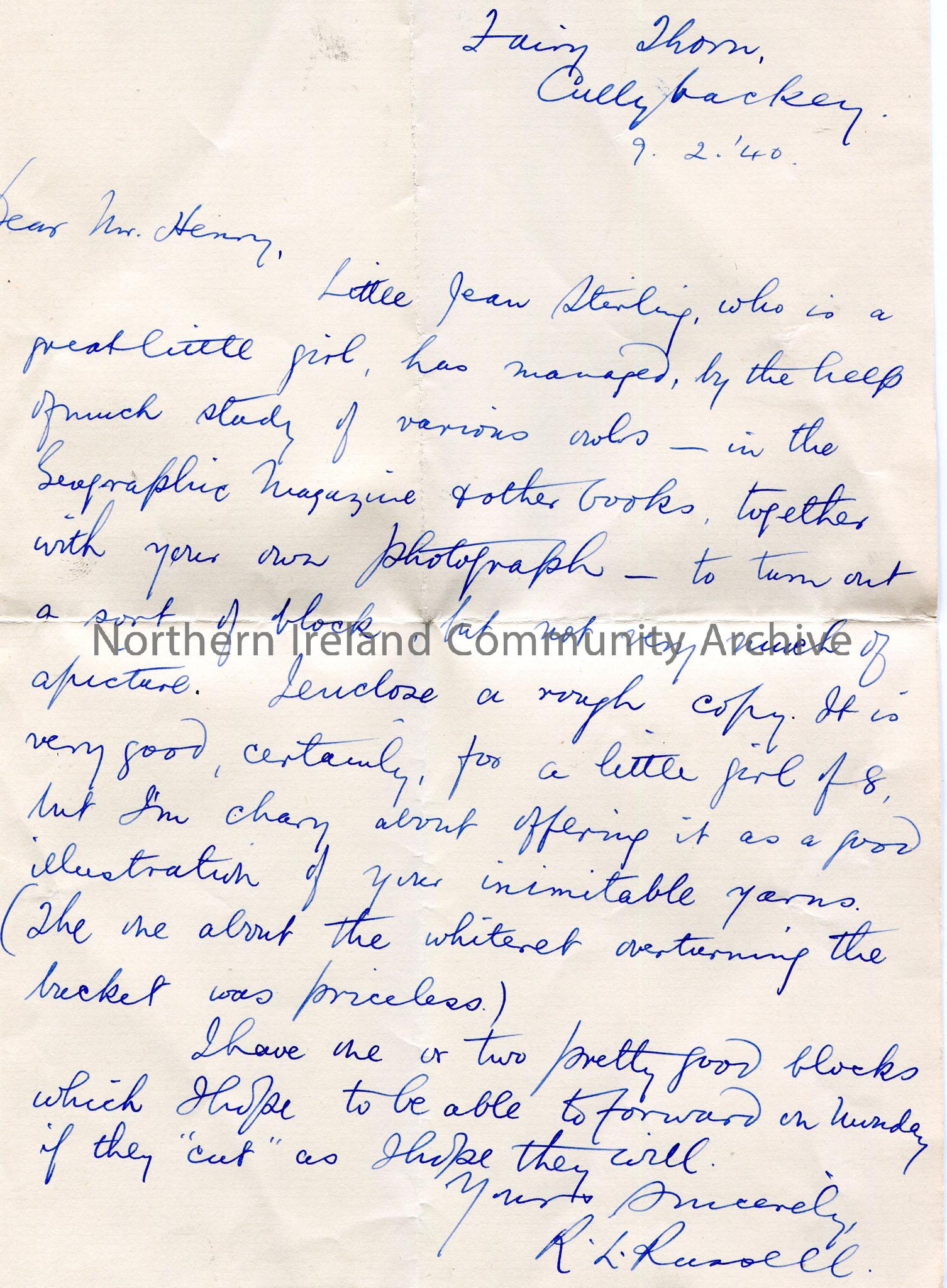 Handwritten letter to Sam Henry. Dated 9th February, 1940. Writes re a pupil Jean Stirling, aged 8, who has created a block after studying Geographic magazine, various books and a photograph from Sam and encloses a rough copy. Has one or two other blocks to send to Sam.
