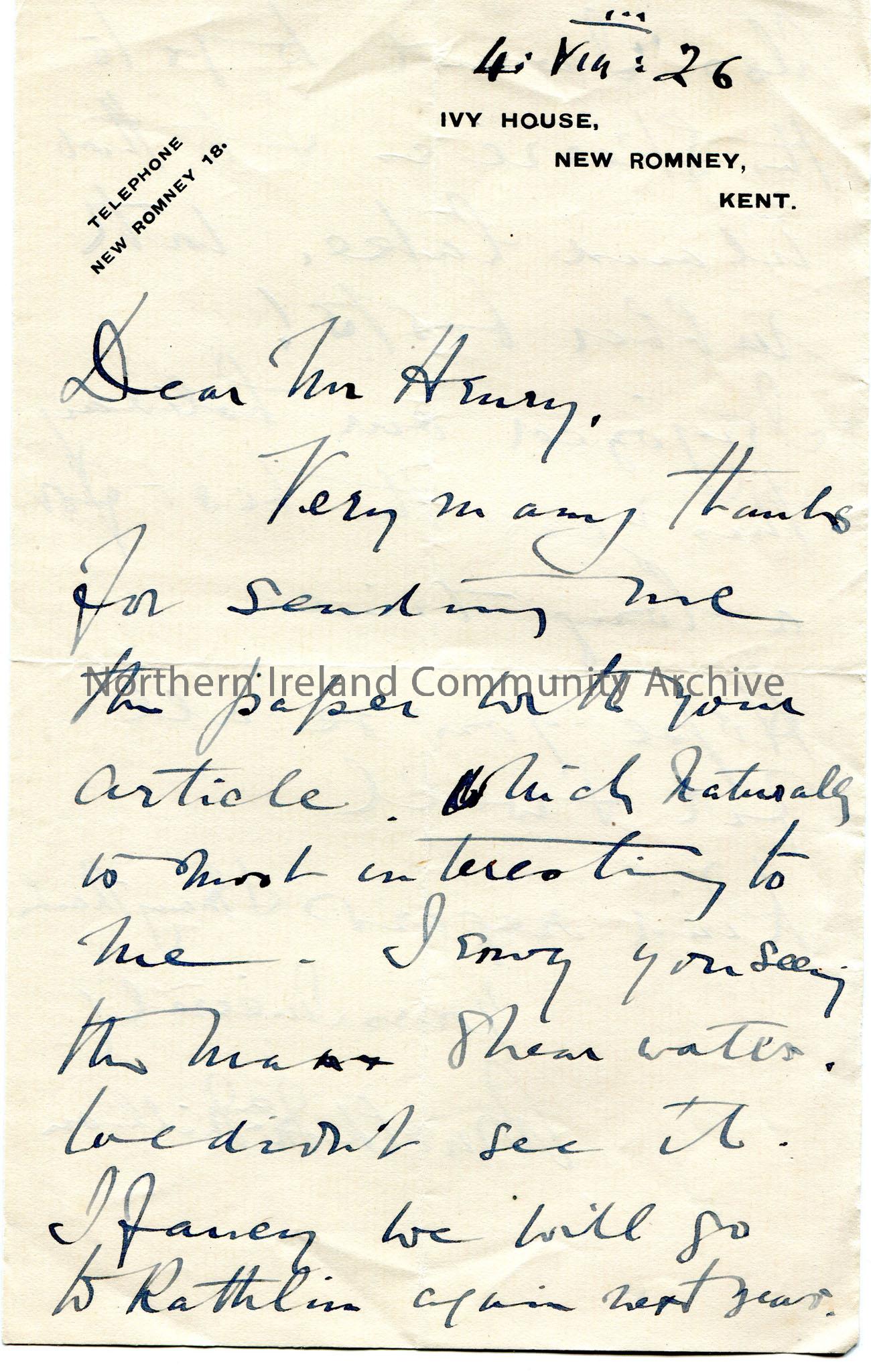 Handwritten letter to Sam Henry (double sided). Thanks Sam for sending a newspaper with his article in it. Writes of going to Rathlin again next year …