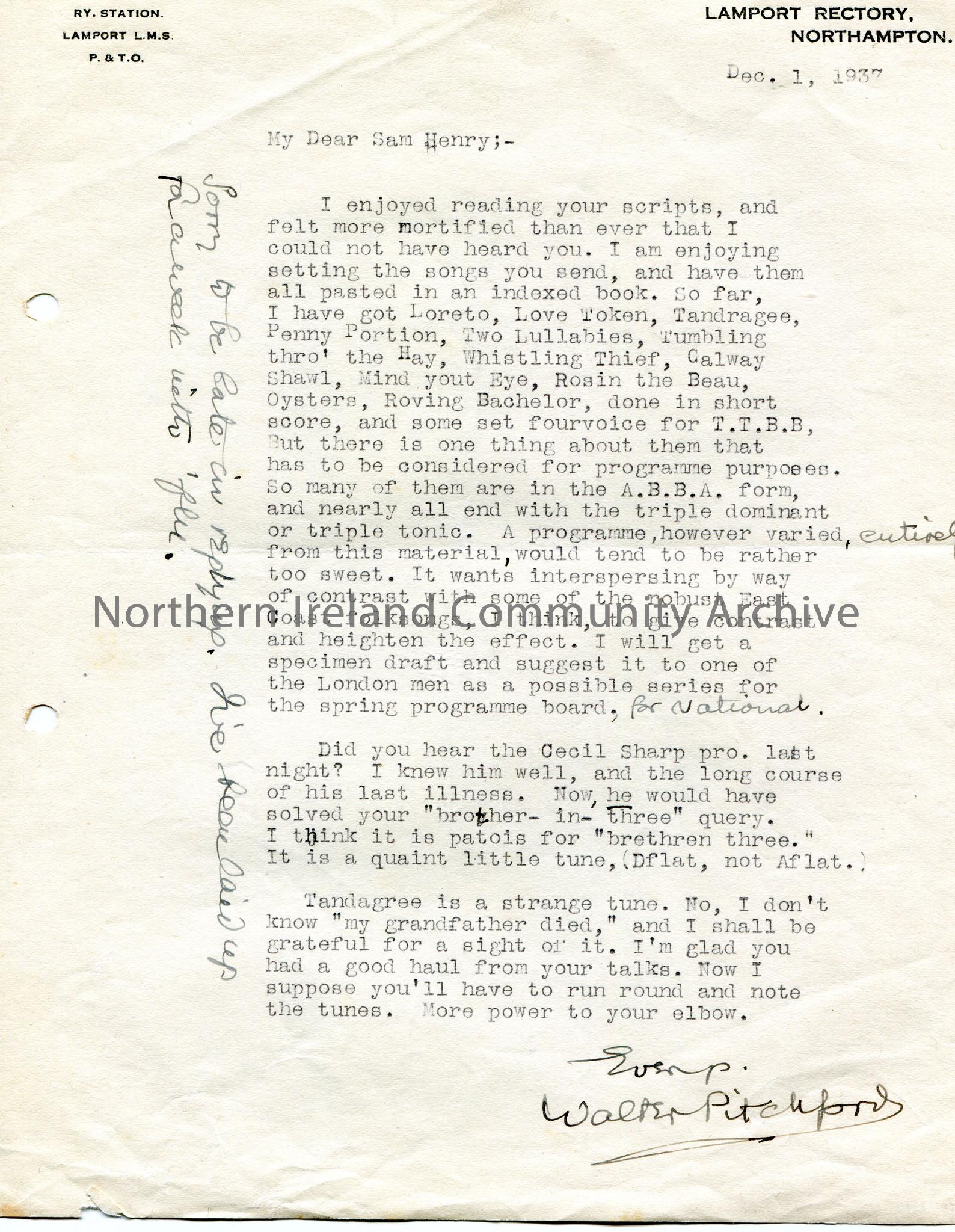 Handwritten letter to Sam Henry. Enjoyed reading the scripts of the talks by Sam. Discusses the songs Sam has sent and which he has set so far. Refers to Cecil Sharp. Mentions the songs 'Tandagree' and 'My Grandfather Died'. Writes a note vertically alongside the typed letter saying he is sorry for the late reply due to flu.