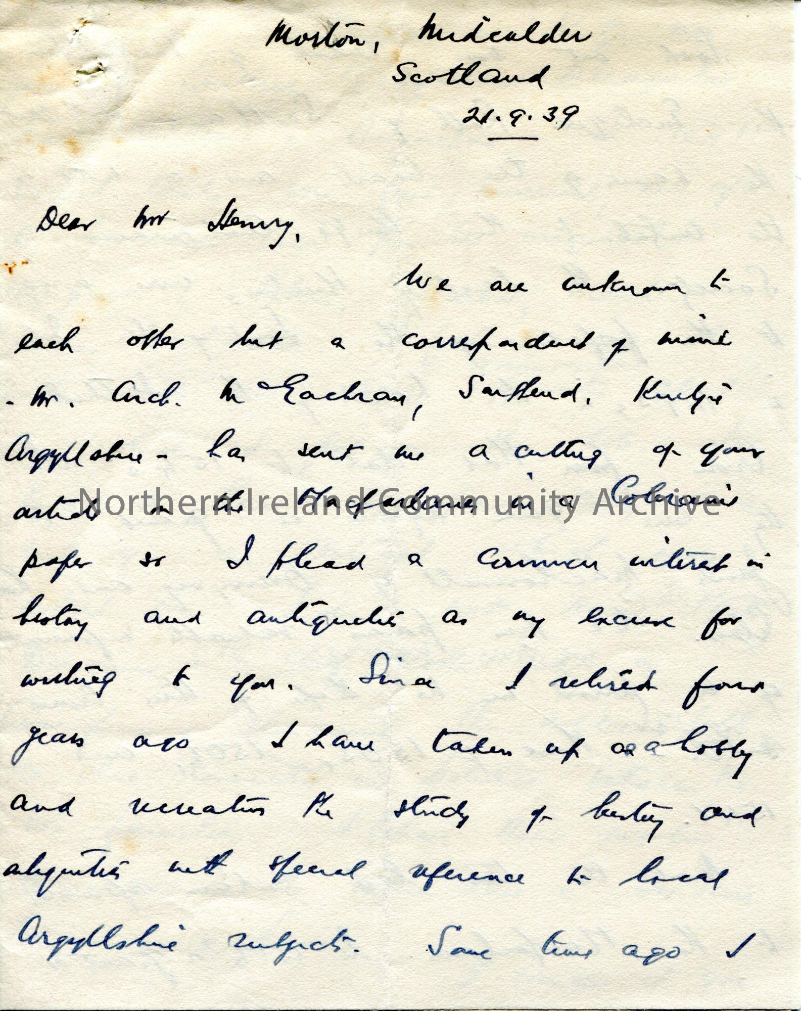 Handwritten letter to Sam Henry from A. McKerral. (Folded and written on 4 sides). They are an acquaintance of Archie McEachran and hold a similar interest in history and antiquities like Sam. Notes a specific interest in local Argyllshire subjects. Discusses MacFarlane genealogy. Asks Sam if there is anyone in Ulster with his family name.