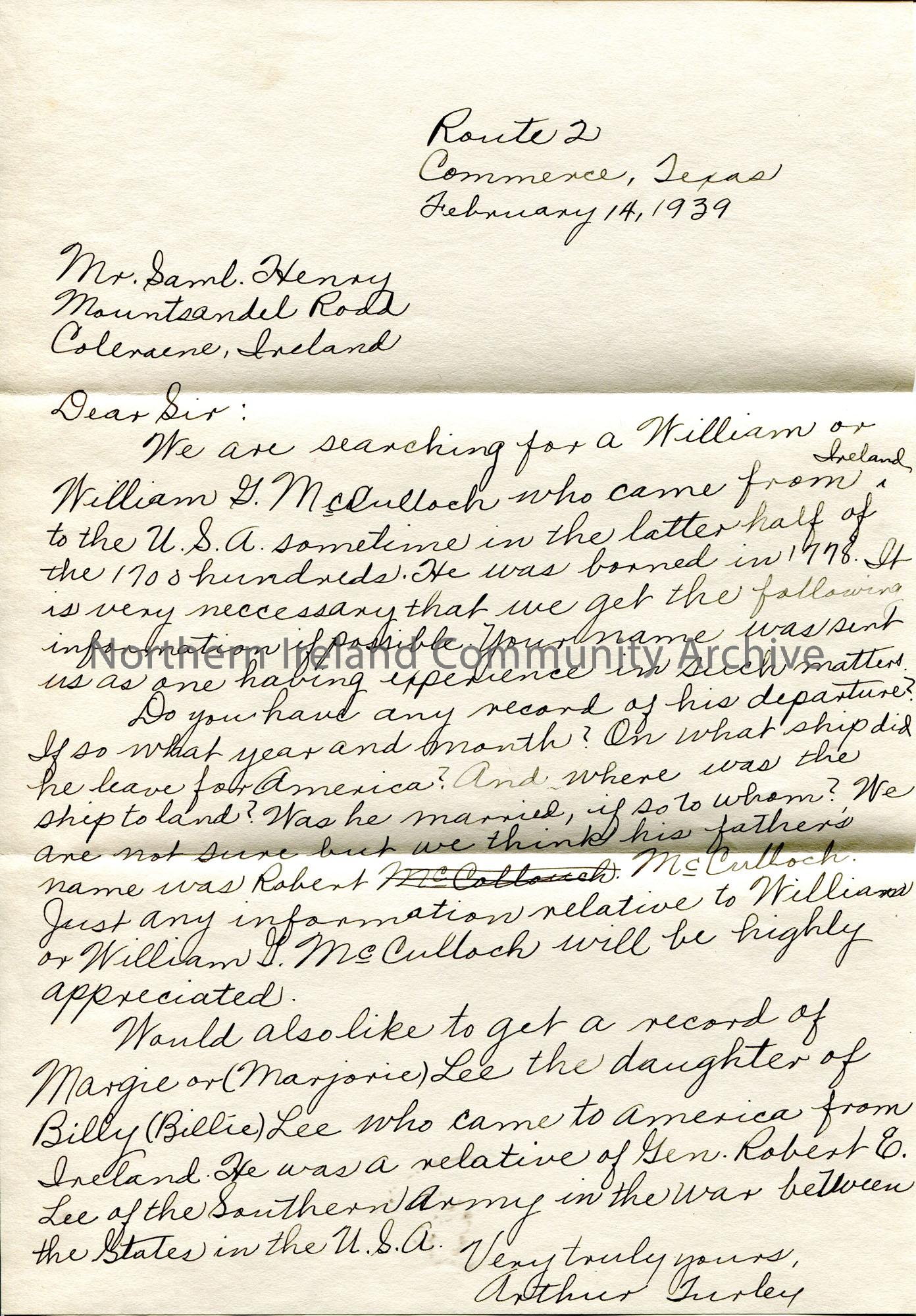 Handwritten letter to Sam Henry from Arthur Turley. Requesting information from Sam re William T McCulloch who emigrated to America from Ireland in the later half of 1700s. Also seeking information on Margie / Marjorie Lee, daughter of Billy / Billie Lee, relative of General Robert E Lee of the Southern Army.