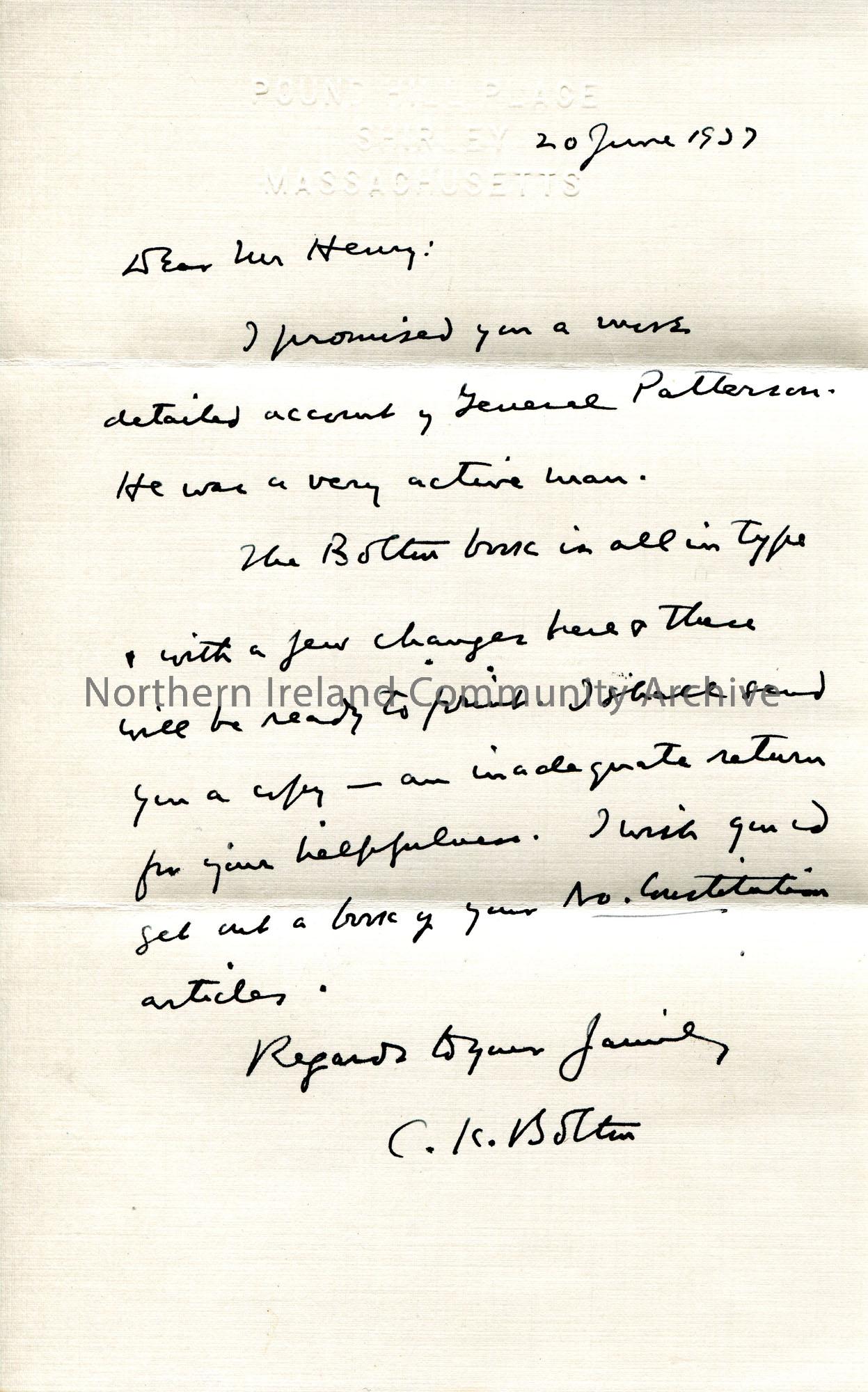 Handwritten letter to Sam Henry from C K Bolton. Encloses a detailed account of General Patterson. Updates Sam on their book progress which will soon be ready. Thinks Sam should make a book of his Northern Constitution articles.