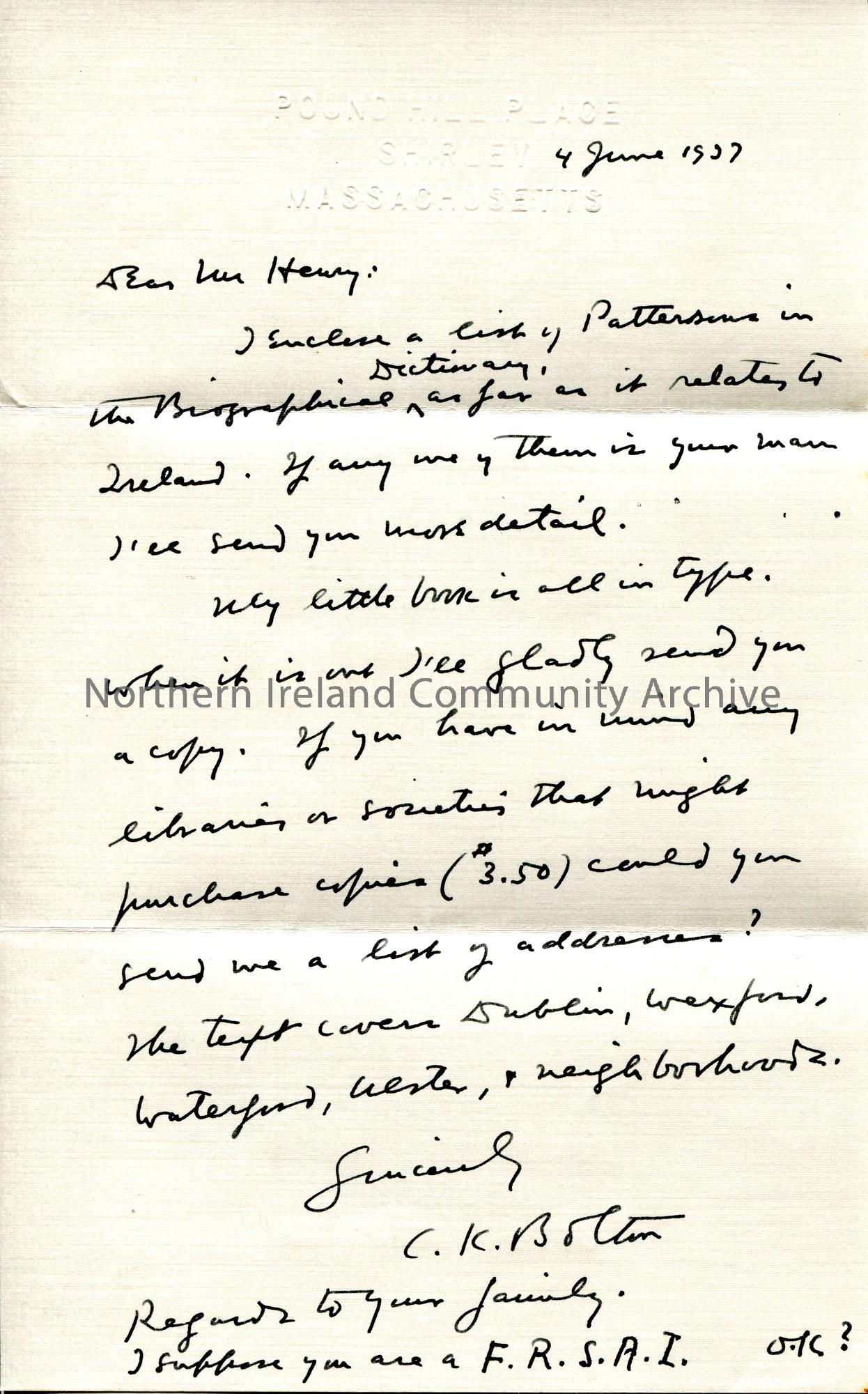 Handwritten letter to Sam Henry from C. K. Bolton. Encloses list of Pattersons relating to Ireland from the Biographical Dictionary. Informs Sam on the progress of their book and promises him a copy. Asks for a list of addresses to send copied of the book to.