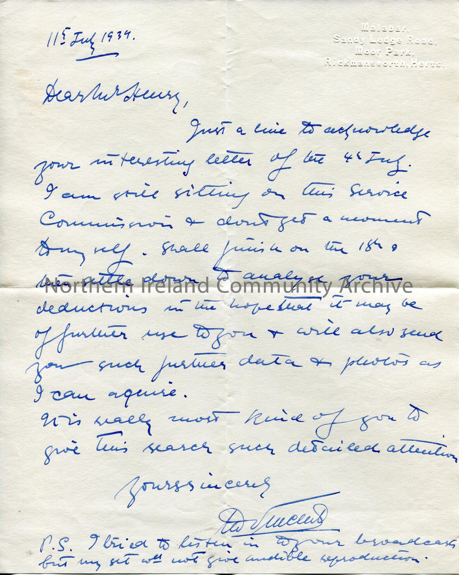 Handwritten letter to Sam Henry from F. A. M. Vincent. He has been sitting on a Service Commission and has not had the time to respond to Sam's letter. Thanks Sam for his assistance in helping research his mother's side of the family. He tried to listen to Sam's broadcast but could not hear it properly.