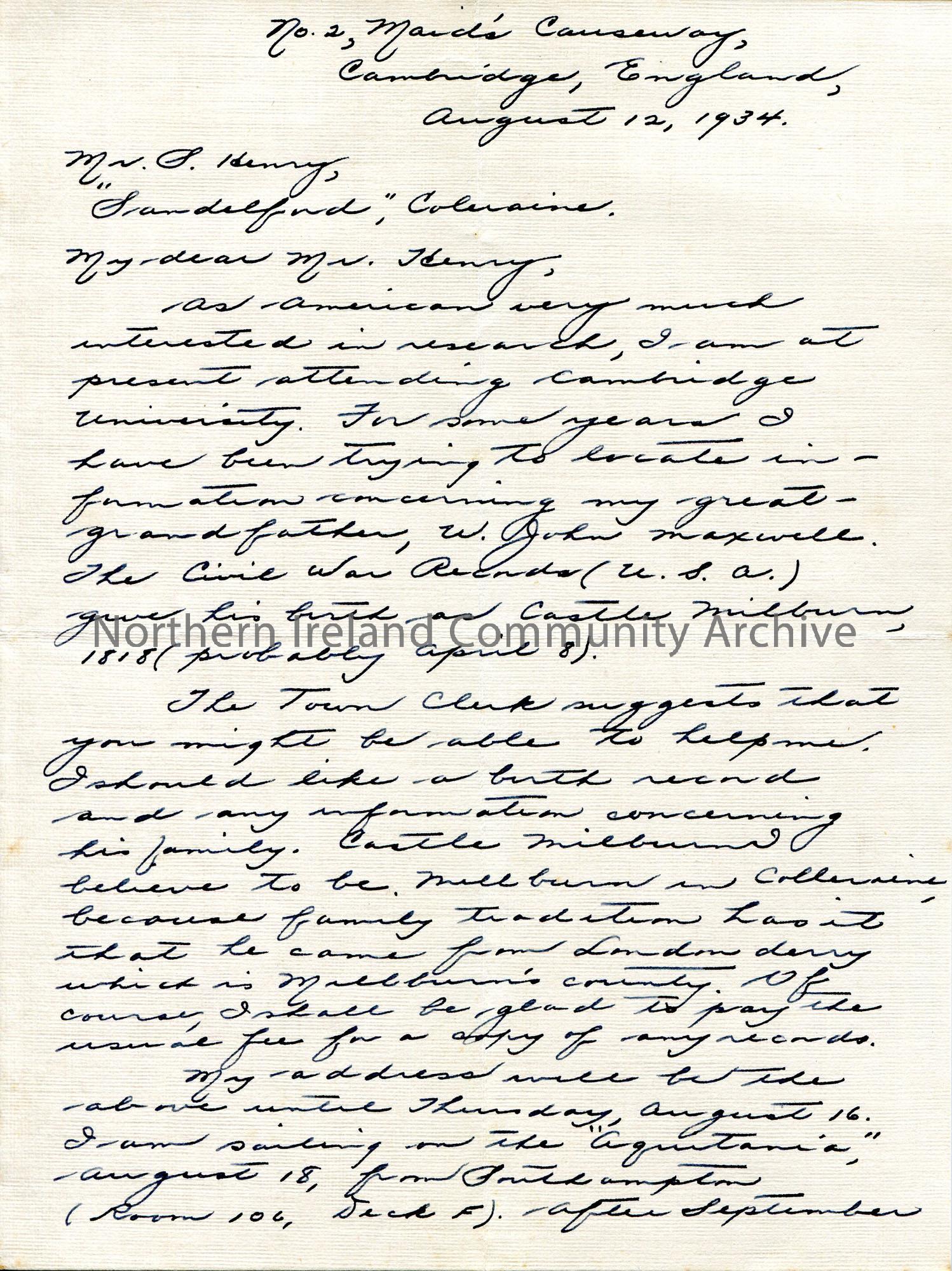 Handwritten letter to Sam Henry from Flora Jane MacDonald. Currently attending Cambridge University and have an interest in their family history. Asks Sam for help to research her great grandfather's family history - W. John Maxwell was born at Castle Milburn in 1818. She believes this to be in Coleraine.