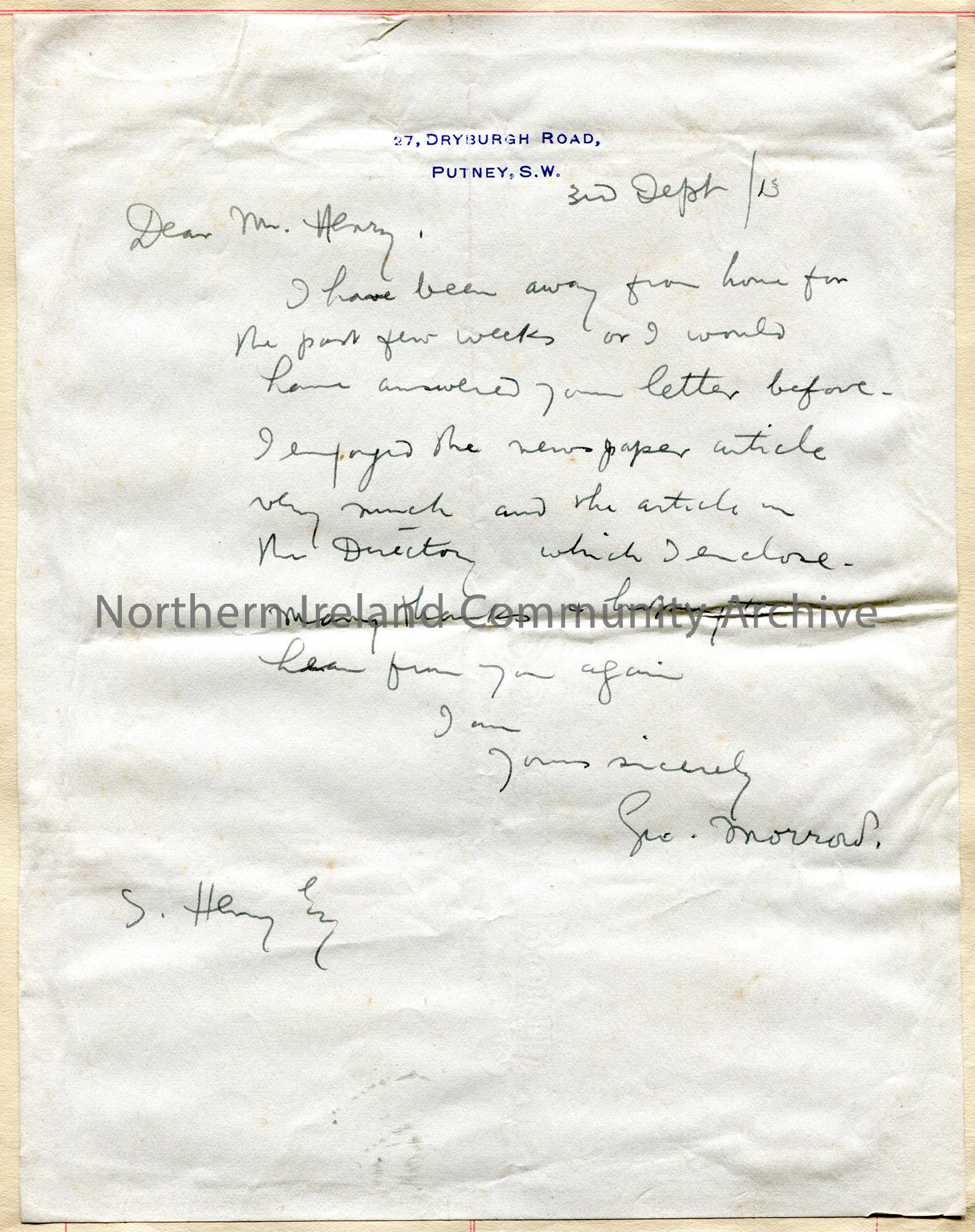 Handwritten letter to Sam Henry from George Morrow. He has not replied to Sam due to his absence from home for a few weeks. Thanks Sam for sending articles.
