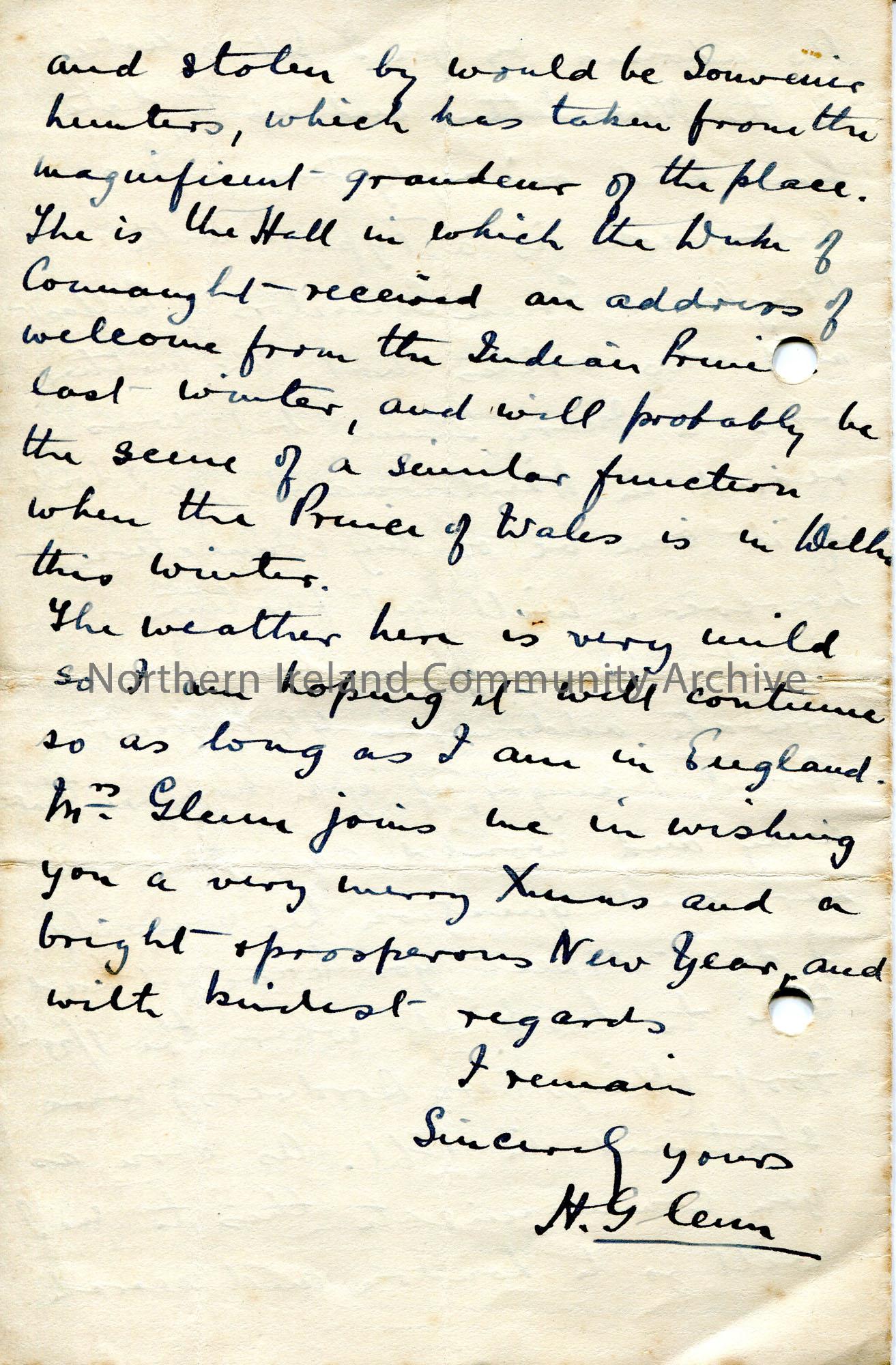 Handwritten letter to Sam Henry from H Glenn. Writes of a pleasant stay in Ireland from which they have just returned. Sending Sam a silver flower stand and framed painted ivory picture from Delhi. They are trying to trace ancestors of the name Glenn. Asks for Sam's help.