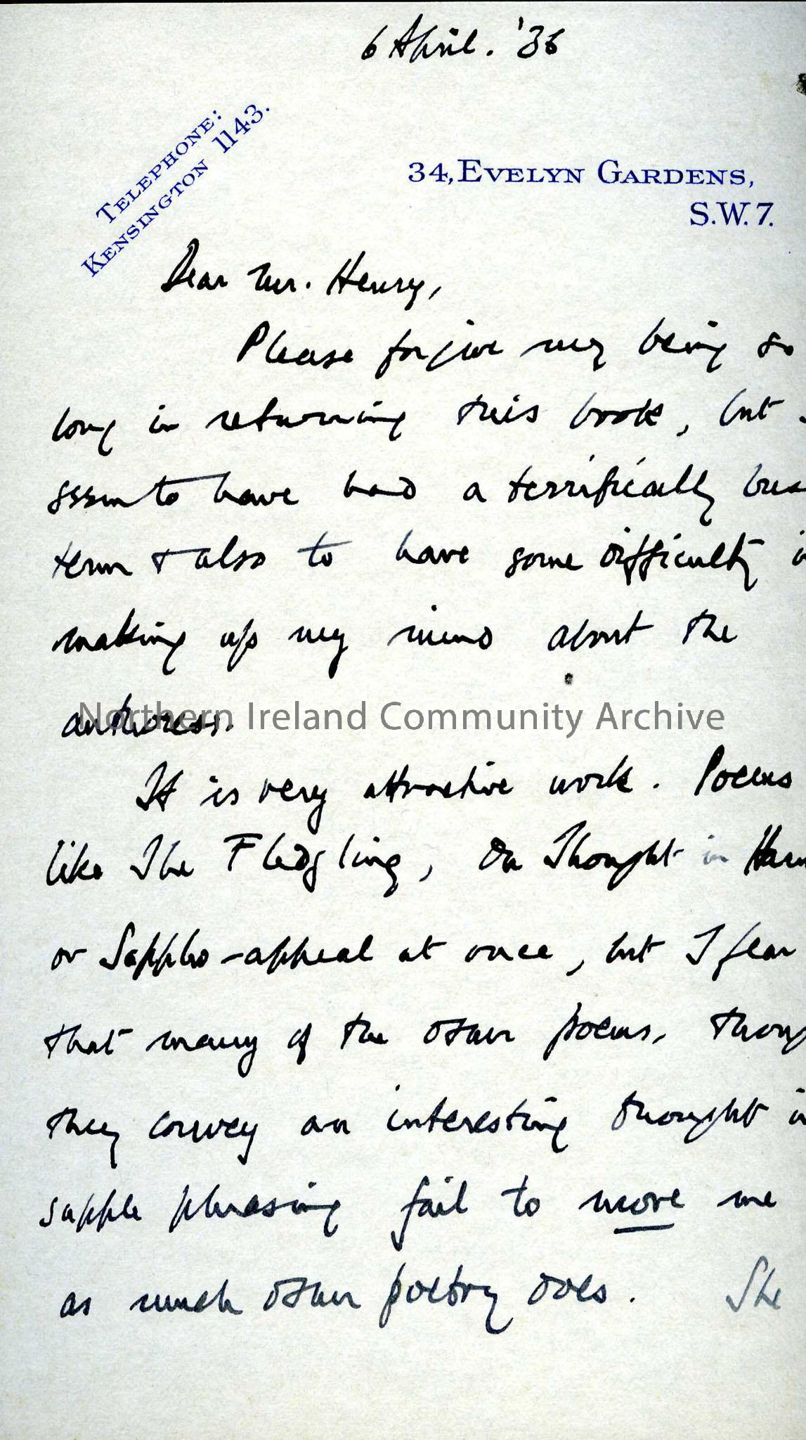 handwritten letter to sam Henry from Lawrence Wilson, commenting on a book of poems he is returning. Found in CM:2011:600.1 but the poems listed in the letter are not from it.