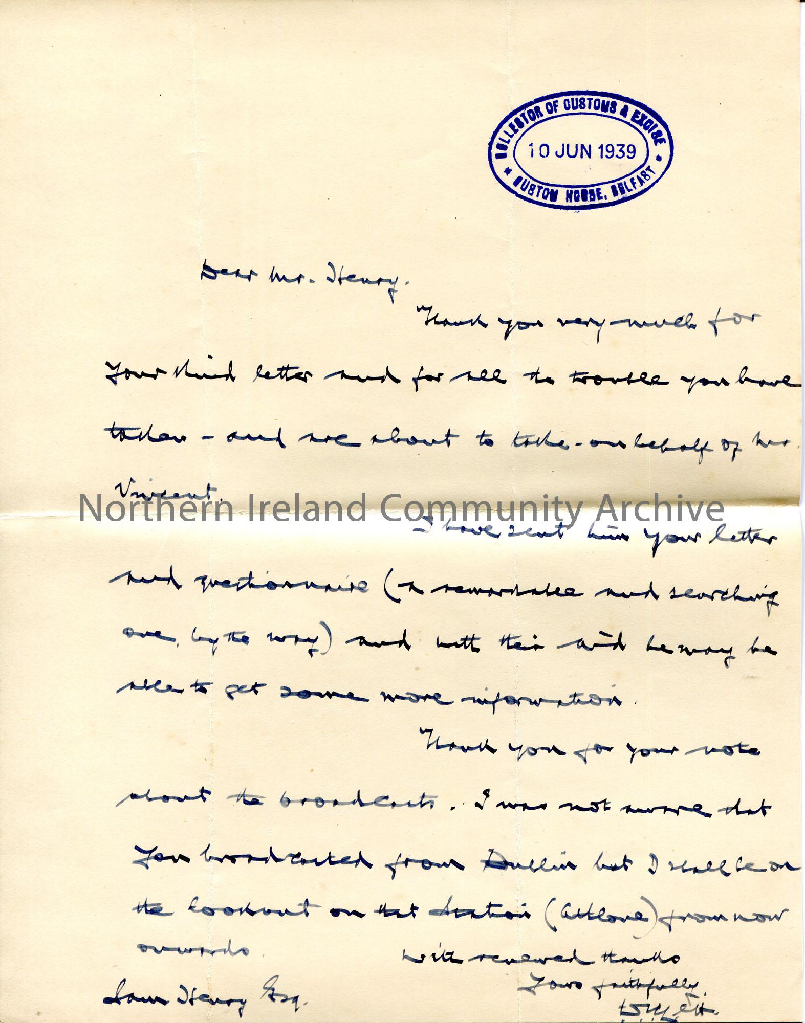 Handwritten letter to Sam Henry from Mr Lett. Thanks Sam for helping to research family history for F A M Vincent. Mr Lett has forwarded one of Sam's genealogy questionnaires for Mr Vincent to complete. Will look out for Sam's broadcast on the Athlone station.