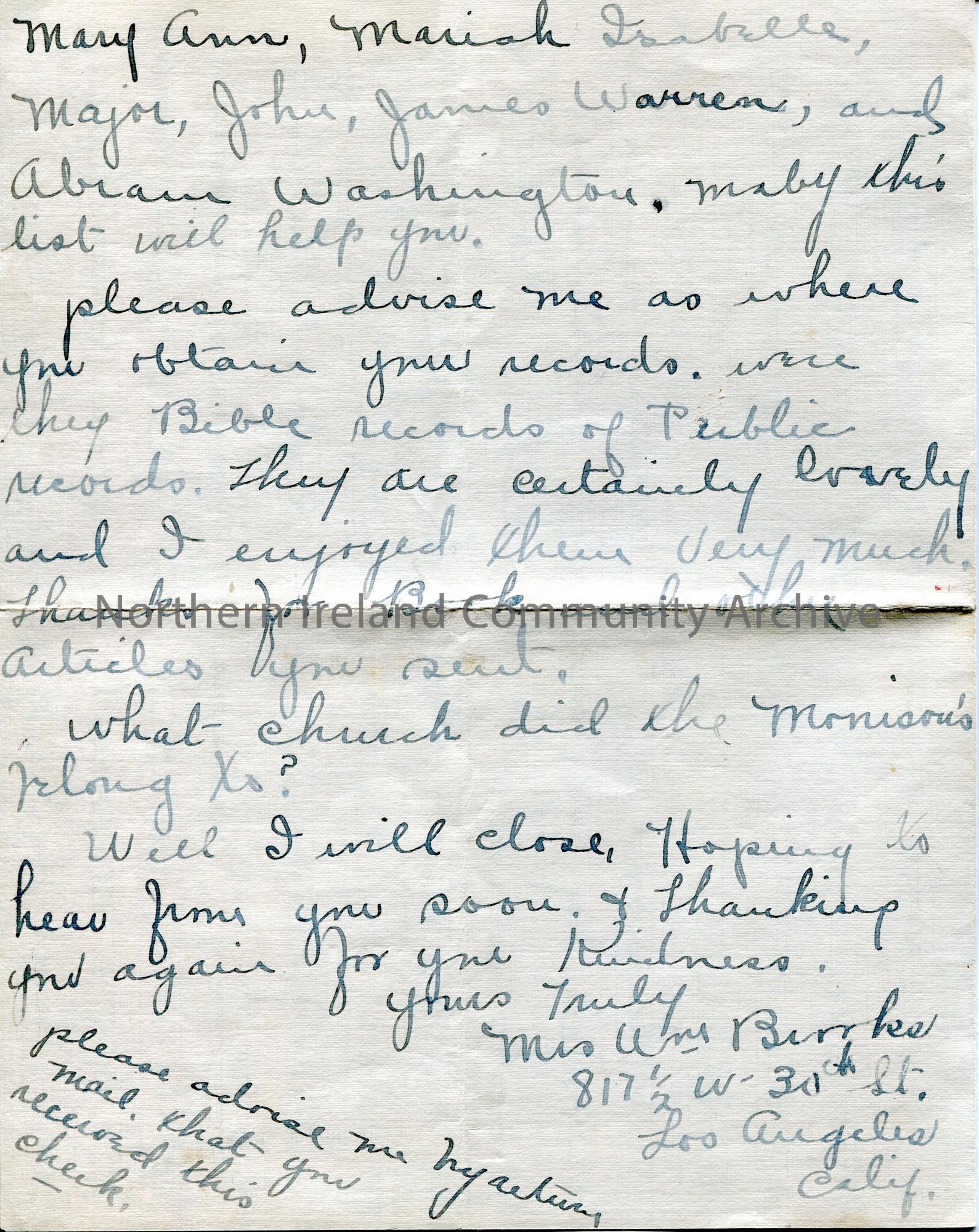 Handwritten letter to Sam Henry from Mrs William Brooks. Writing re her family history and if Sam can help. – scan084c