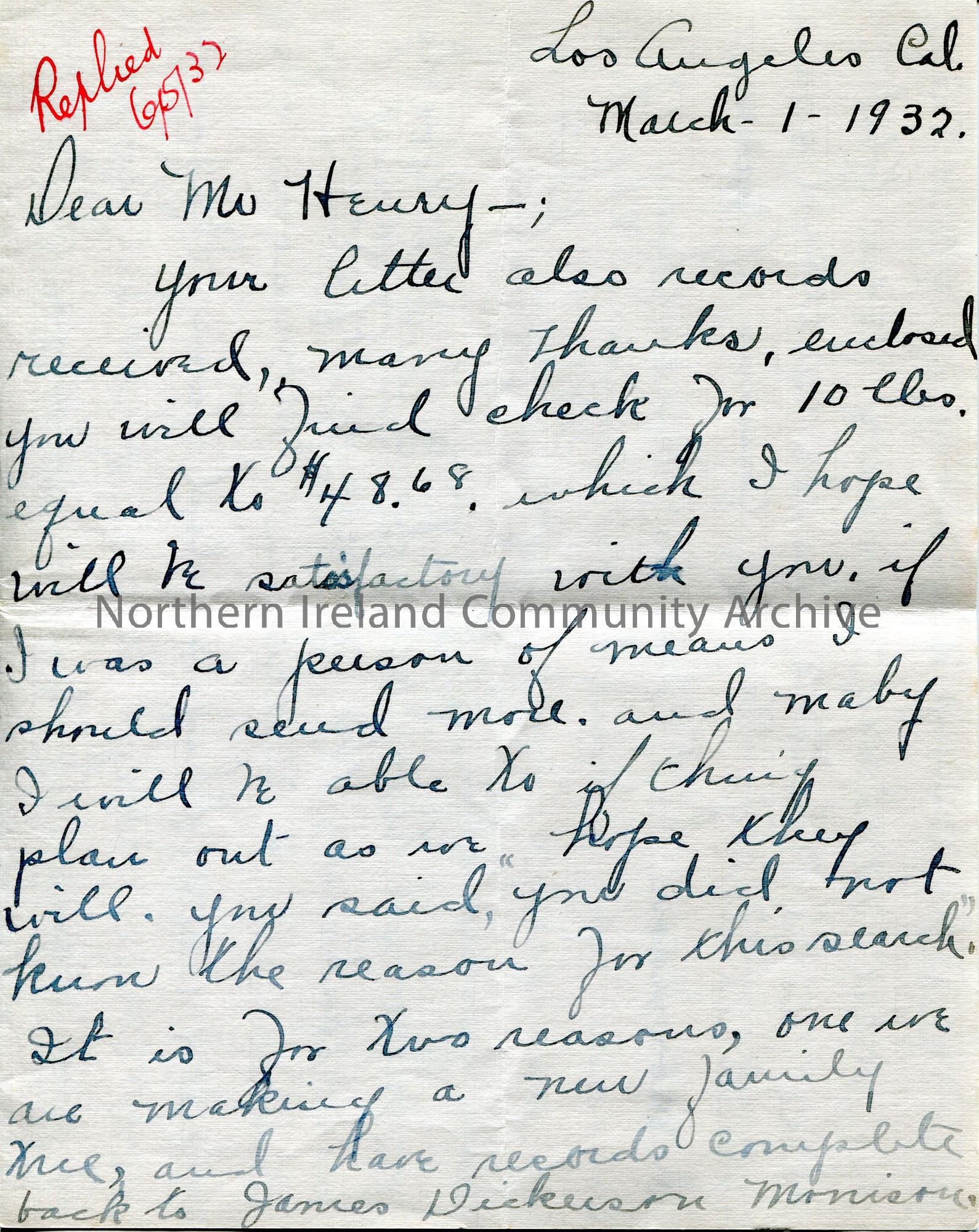 Handwritten letter to Sam Henry from Mrs William Brooks. Writing re her family history and if Sam can help.