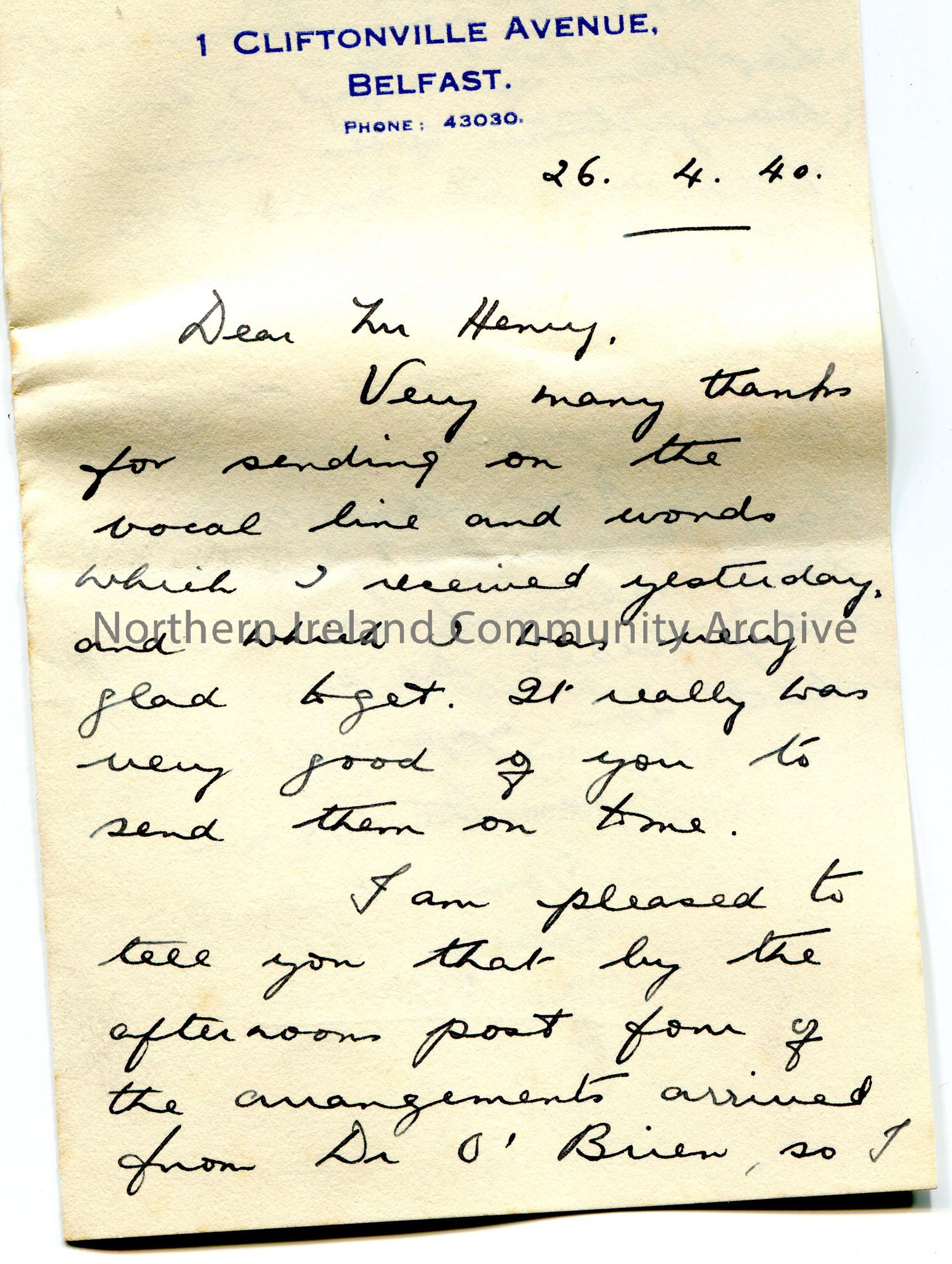 Handwritten letter to Sam Henry from Nan Shaw of 1 Cliftonville Avenue, Belfast. Dated 26th April, 1940. Thanks Sam for sending songs. Received arrangements from Dr O'Brien and asks Sam to send words of "The Speckled Hen". Looking forward to 2nd May to take part in one of Sam's broadcasts.