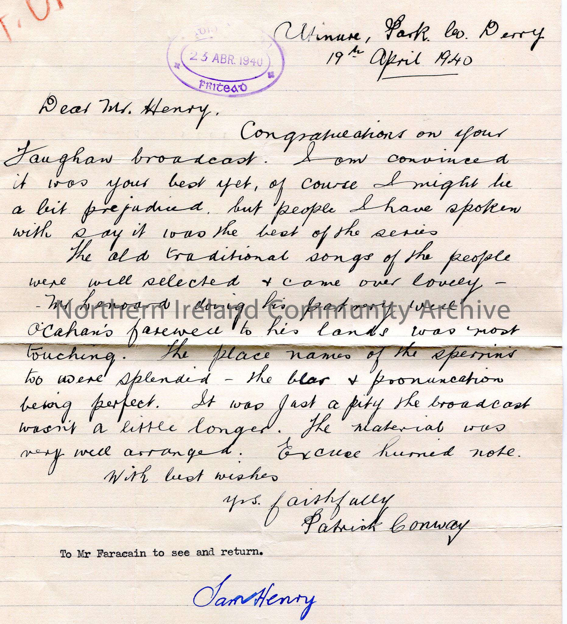 Handwritten letter to Sam Henry from Patrick Conway. Addressed from Altinure Park, Co. Derry. Dated 19th April, 1940. Stamped 23 Abr 1940. Congratulating Sam on his Faughan broadcast. Refers to Mr Leonard having played his part well. The place names of the Sperrins were pronounced well. 'To Mr Faracain to see and return' typed at end of letter and signed Sam Henry.