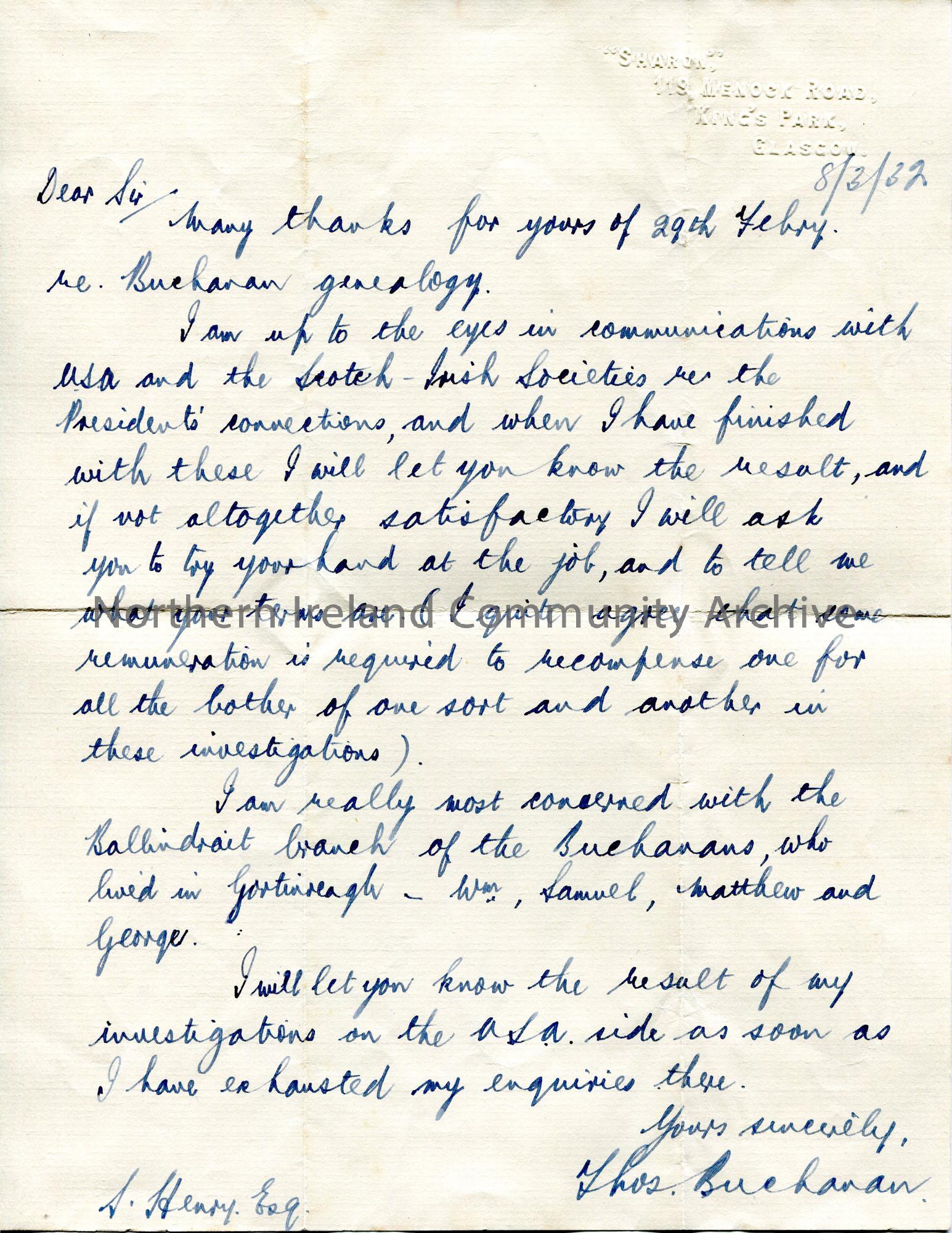 Handwritten letter to Sam Henry from Thomas Buchanan. Informing Sam re Buchanan genealogy. He will continue research into Presidential connections and…