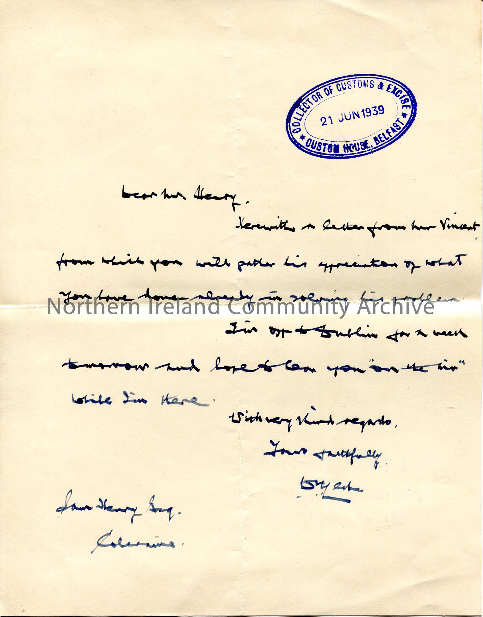 Handwritten letter to Sam Henry from W T C Lett. Encloses letter from Mr Vincent in which he writes of his appreciation for Sam's help in researching his family history. Hopes to hear one of Sam's broadcasts whilst in Dublin.