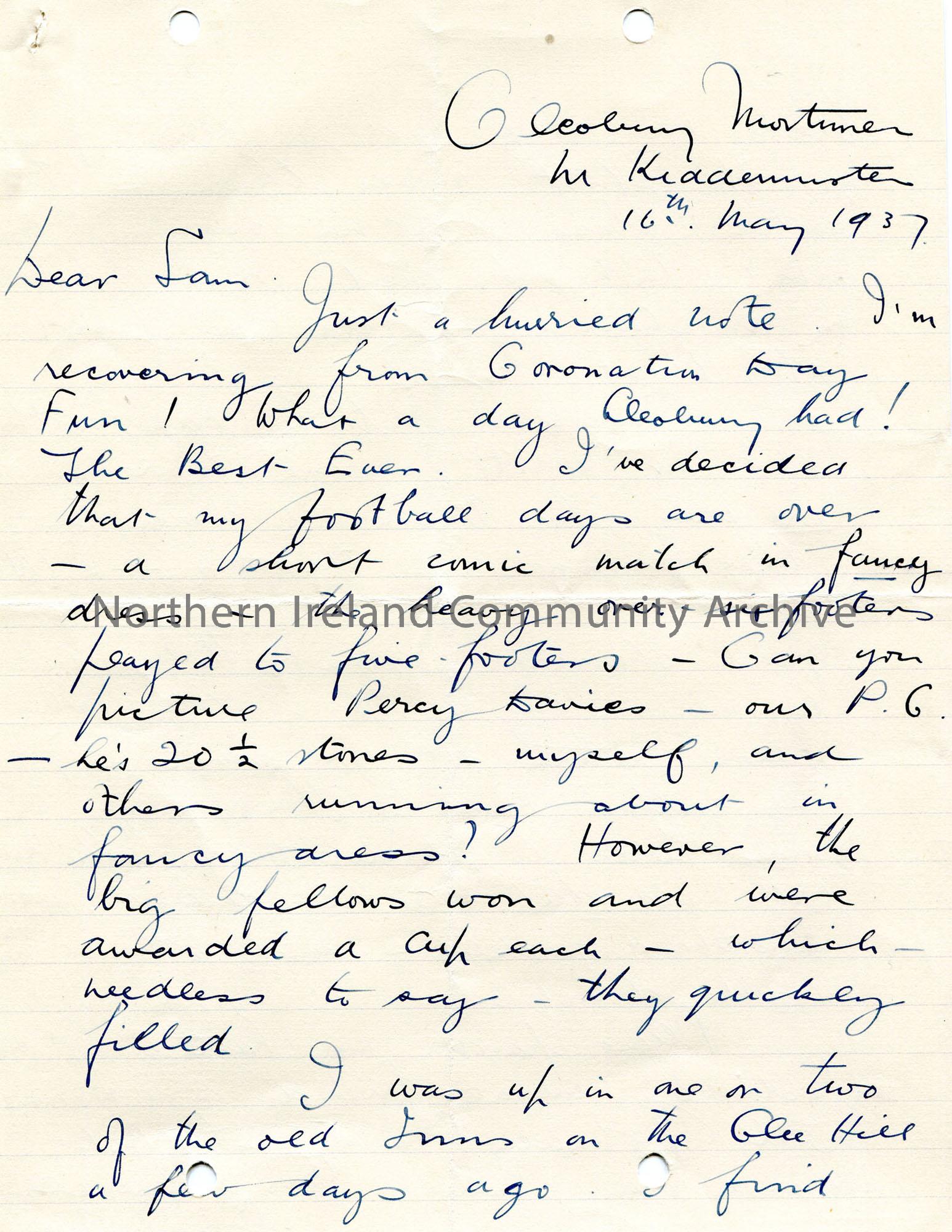 Handwritten letter to Sam Henry. He is recovering from Coronation Day. Writes of playing football in fancy dress and of being on the Clee Hills and me…