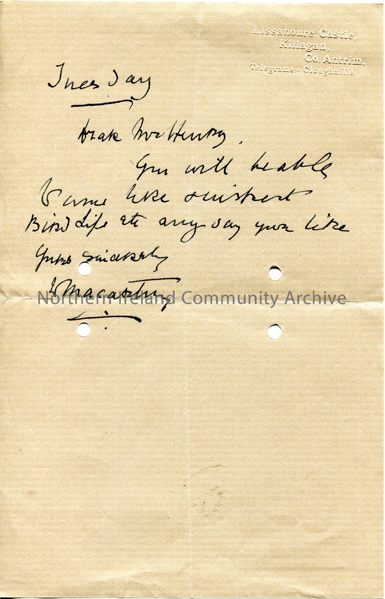 Handwritten letter to Sam Henry. Informing Sam he is welcome to inspect birds at their residence whenever he likes.