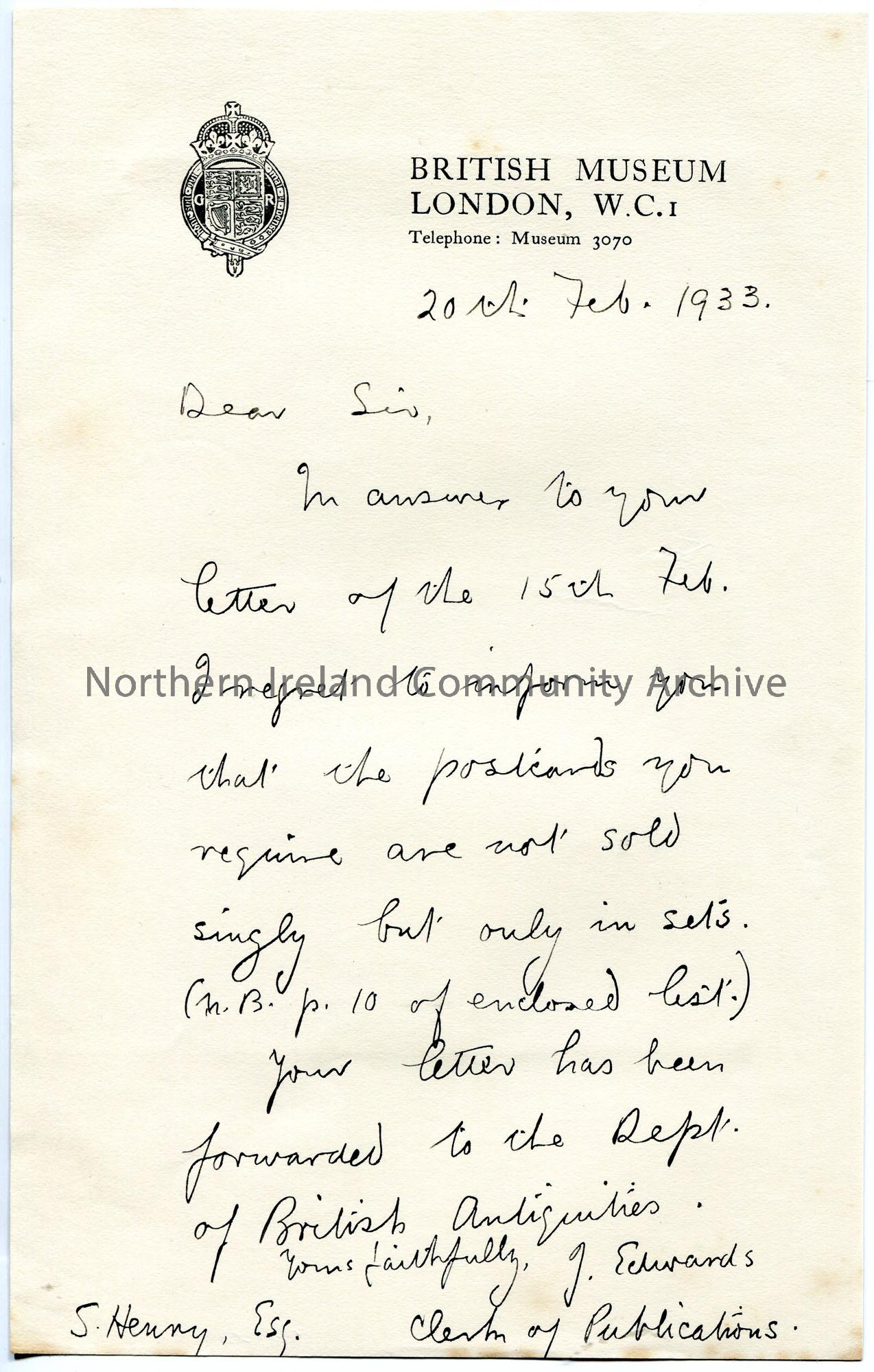 Handwritten letter to Sam Henry. Informing Sam that the postcards he requires cannot be sold singly and his letter has been passed to the Department of British Antiquities. Encloses list of Pictorial Postcards.