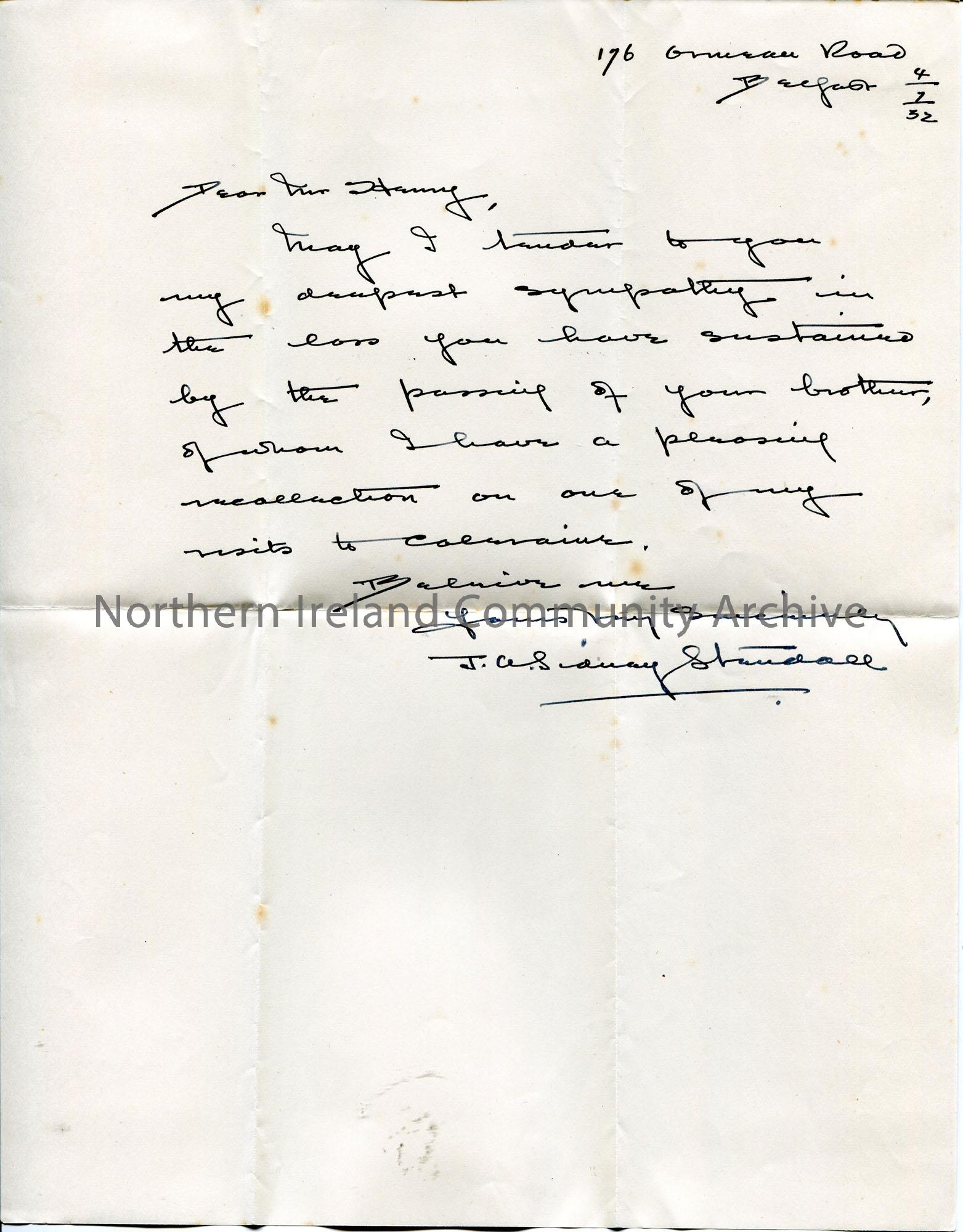 Handwritten letter to Sam Henry. Sends their sympathies to Sam on the death on his brother William, Town Clerk, Coleraine.