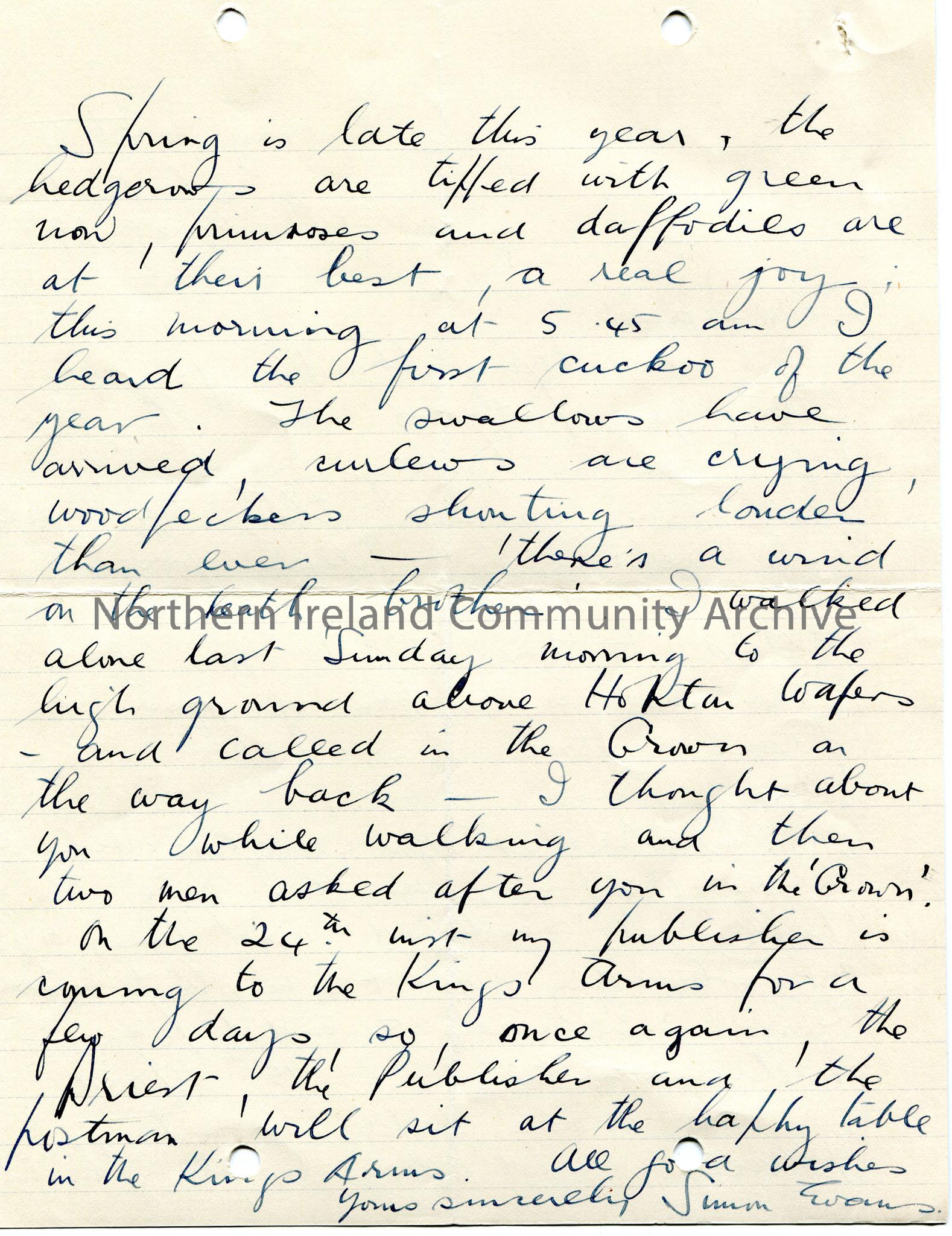 Handwritten letter to Sam Henry. Thanks Sam for his letter, postcard and newspaper. Apologises for delay in reply as he has been busy. Writes that he is to give a talk in Midlands Station re country place names around Cleobury Mortimer on 15th April in the Children's Hour. Talks of the Springtime and birds. Two men asked after Sam while Evans was in the 'Crown'. Refers to meeting his publisher.