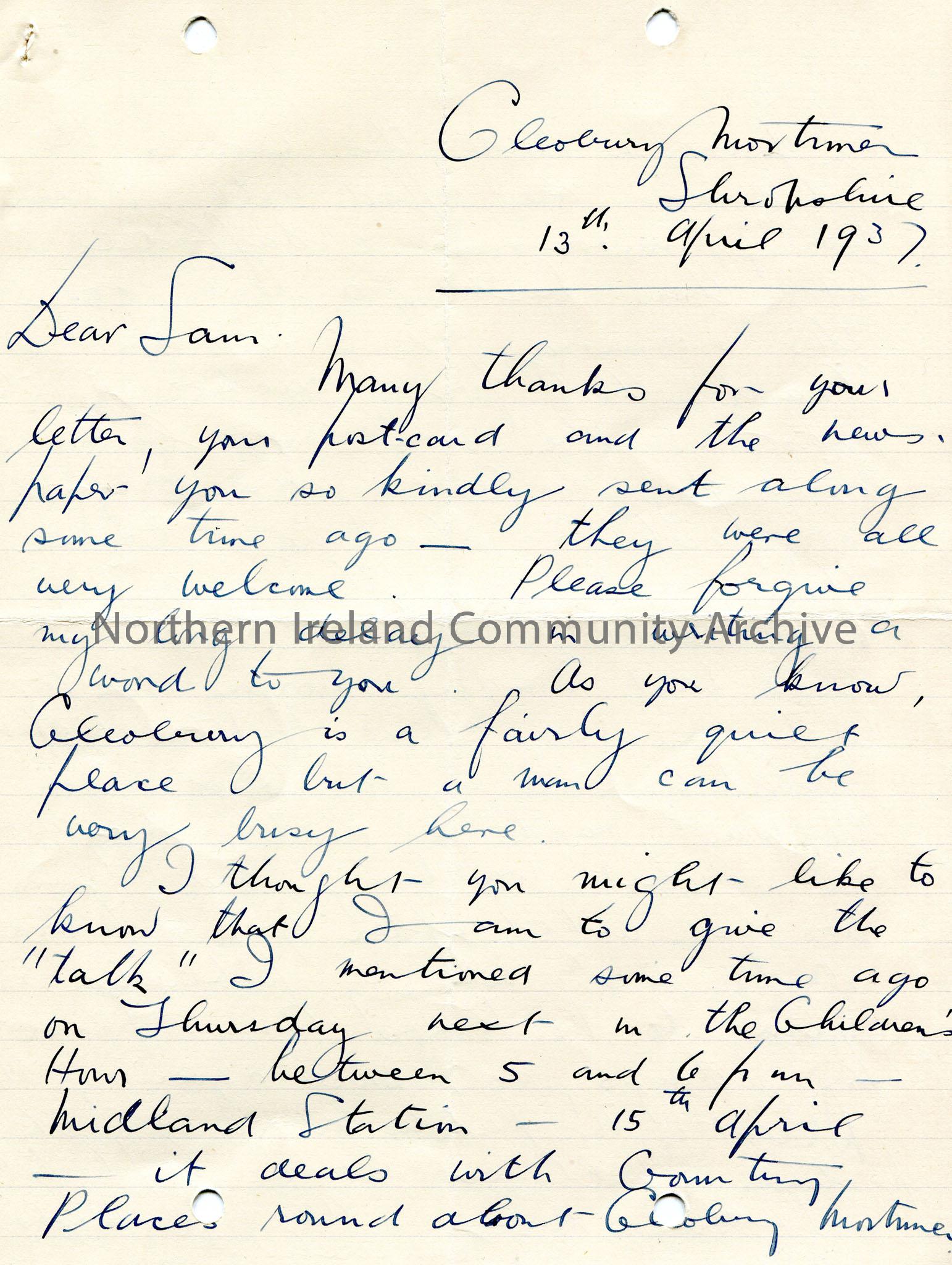 Handwritten letter to Sam Henry. Thanks Sam for his letter, postcard and newspaper. Apologises for delay in reply as he has been busy. Writes that he is to give a talk in Midlands Station re country place names around Cleobury Mortimer on 15th April in the Children's Hour. Talks of the Springtime and birds. Two men asked after Sam while Evans was in the 'Crown'. Refers to meeting his publisher.
