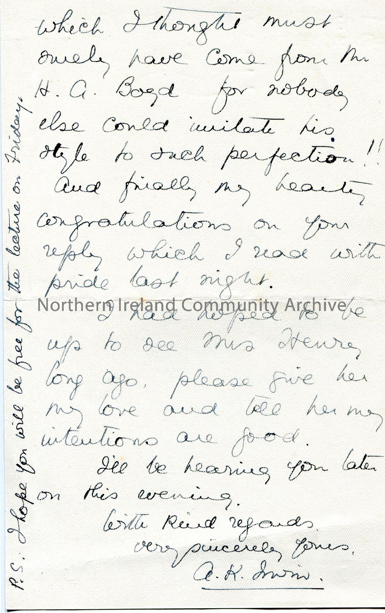 Handwritten letter to Sam Henry. Writes of his interest in the broadcasts on the BBC and comments on how clear his voice came across. Mentions a letter to the Editor of the Newsletter from H. A. Boyd and congratulates Sam on his reply. Hoped Sam will be free for the lecture on Friday.
