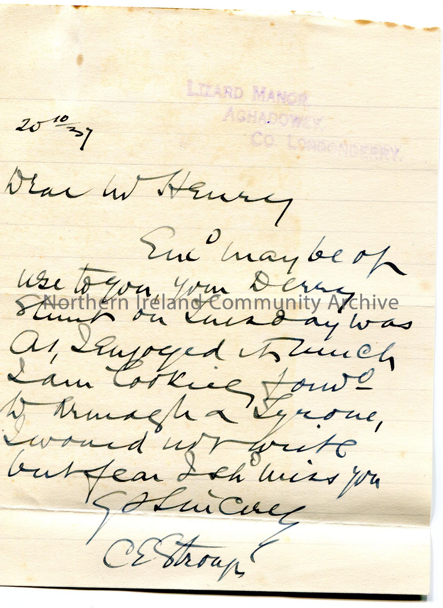 Handwritten letter to Sam Henry. Writes that they enjoyed Sam’s Derry broadcast and look forward to Armagh and Tyrone.