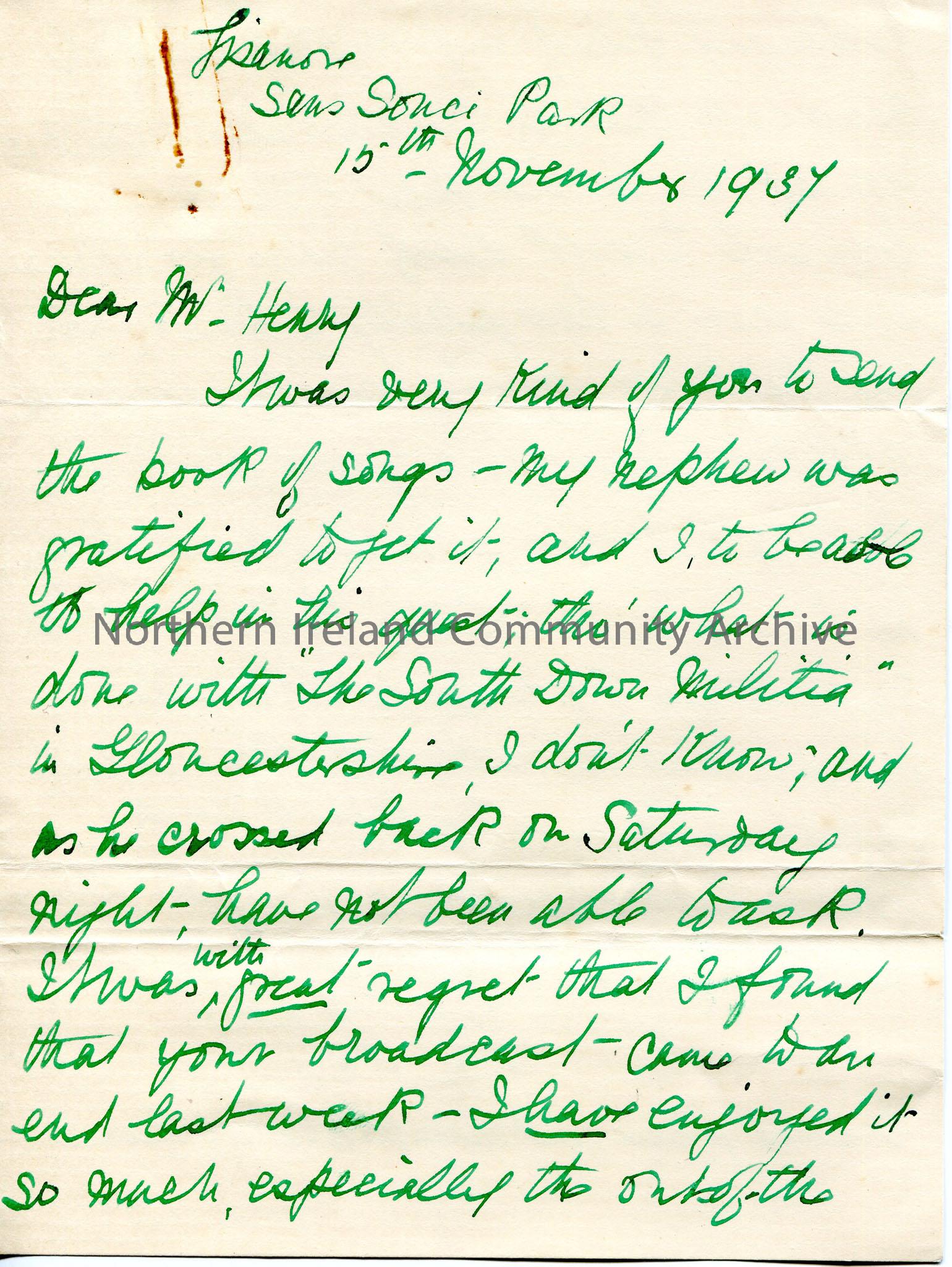 Handwritten letter to Sam Henry. Writing re a book of songs sent by Sam. Refers to '"the South Down Militia in Gloucestershire".' Regrets the fact that Sam's broadcasts have finished. Mentions that he has not been able to leave his home for 7 years which gives him time to listen to the broadcasts. Writes that there is so much talent in the North and resents the 'importation of outsiders.' Refers to the 'Black North'.