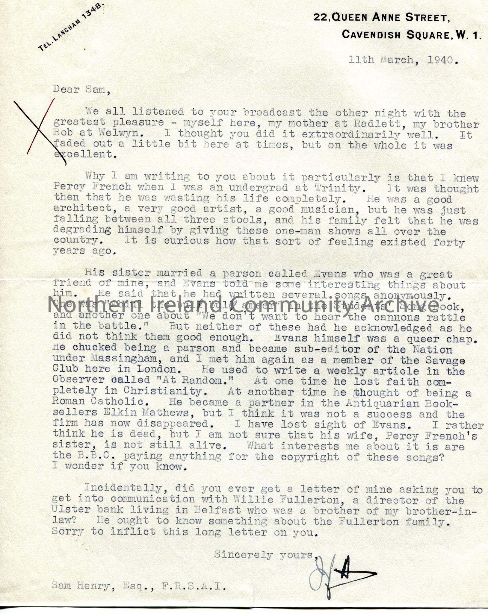 Handwritten letter to Sam Henry. Writing re Sam's broadcast re Percy French. Their mother and brother Bob all listened to it. They knew Percy French as an undergraduate at Trinity. Tells Sam how French's family felt about his studies and work. Also tells Sam of Percy French's sister's husband named Evans - his career and religious beliefs. Sam is trying to find information re Fullerton family. X beside first paragraph.