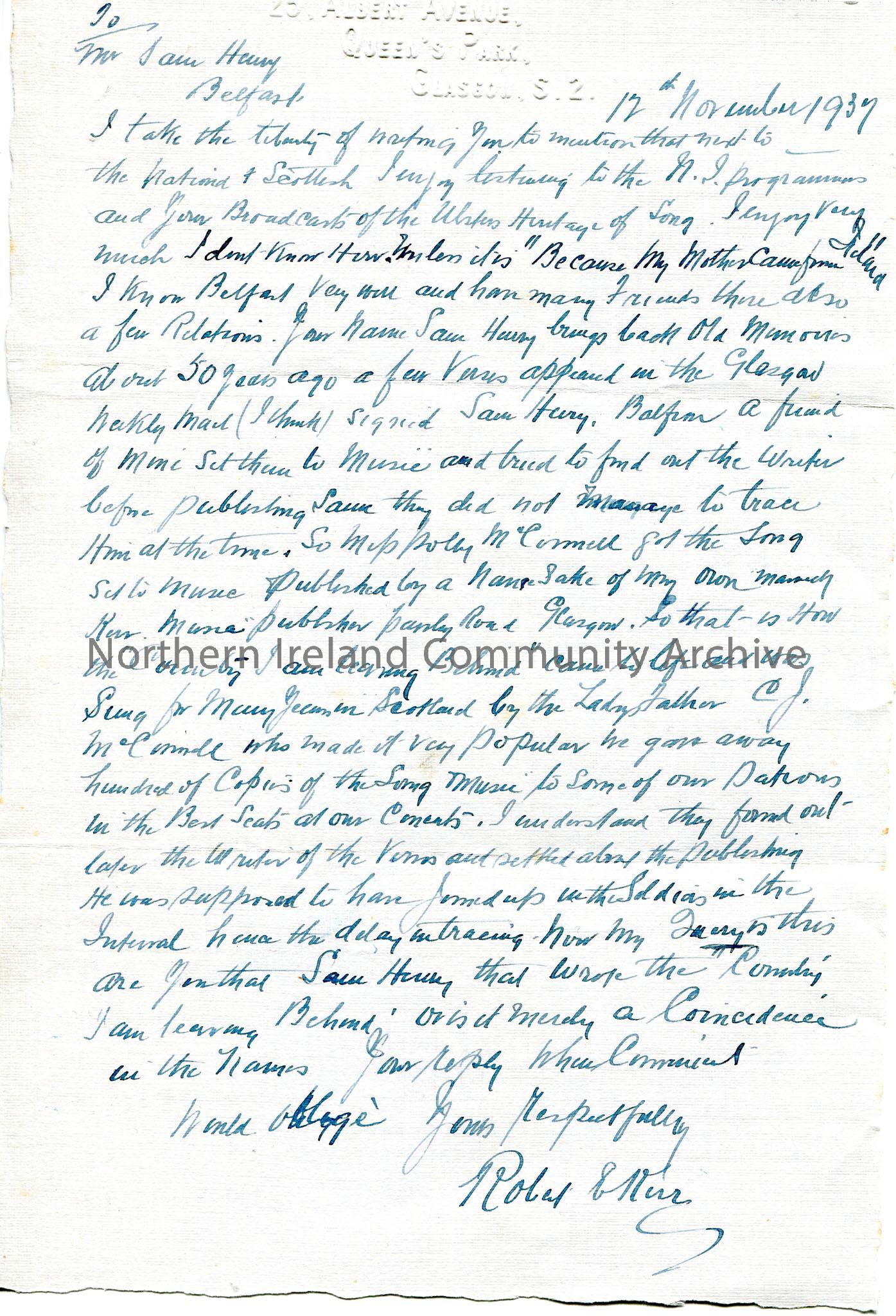 Handwritten letter to Sam Henry. Writing re Sam's programmes re Ulster's Heritage of Song. They have friends and relations in Belfast. Unsure whether Sam is the author of various verses printed in the Glasgow papers.