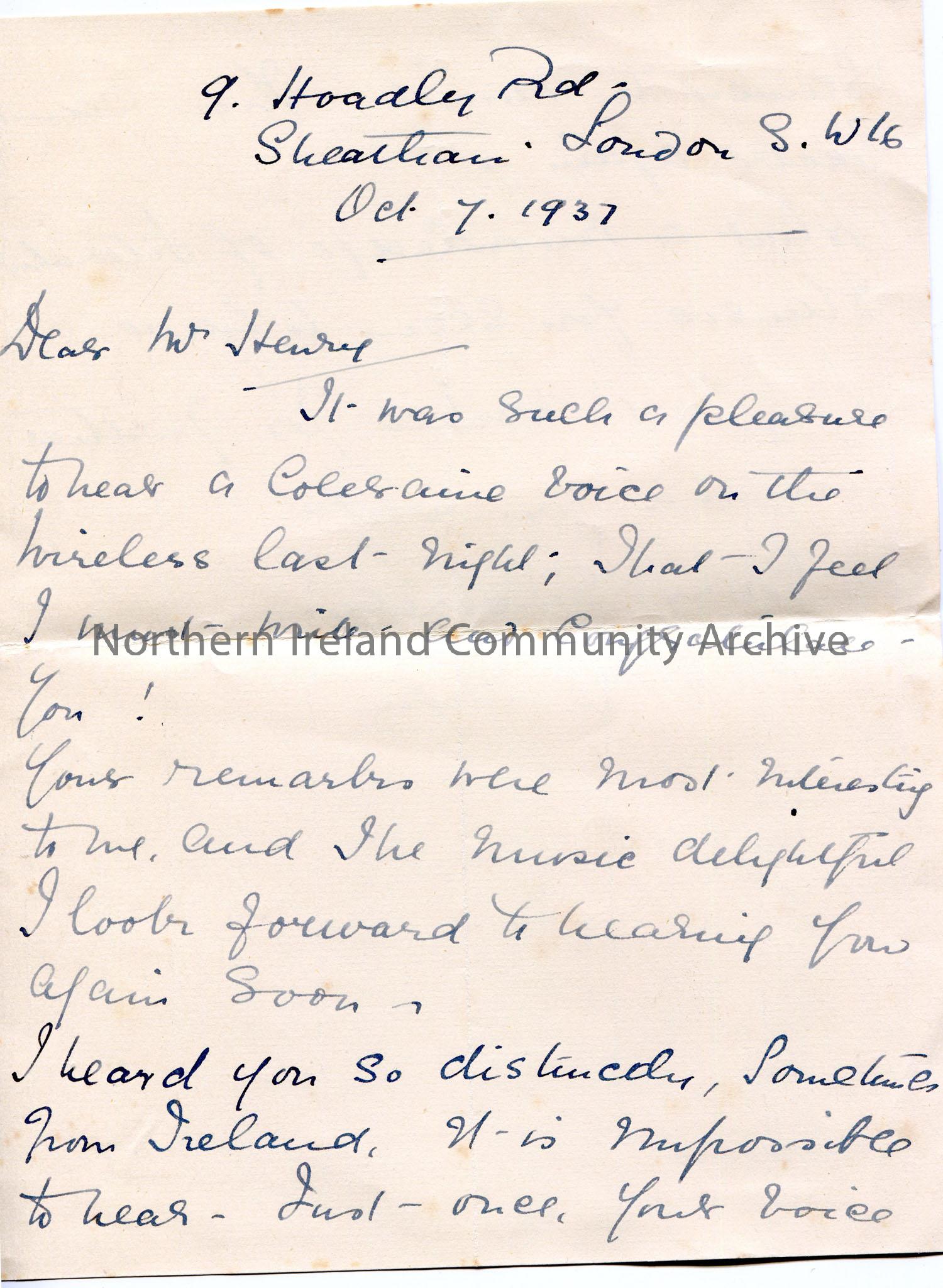 Handwritten letter to Sam Henry. Writing re the broadcast on 6th October. Praises Sam on the content and looks forward to more broadcasts.