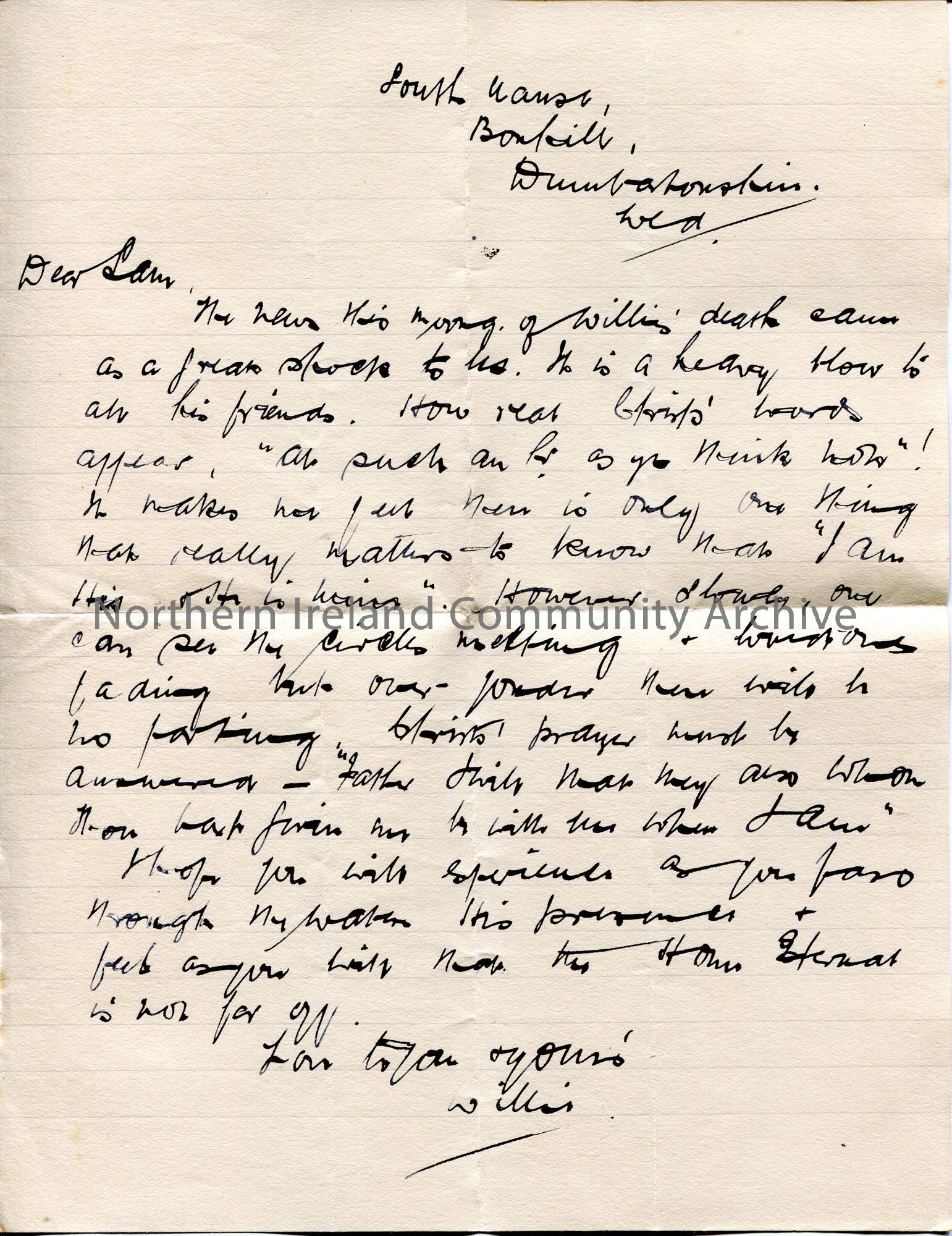 Handwritten letter to Sam Henry. Writing re the death of Sam’s brother, William, Town Clerk of Coleraine.