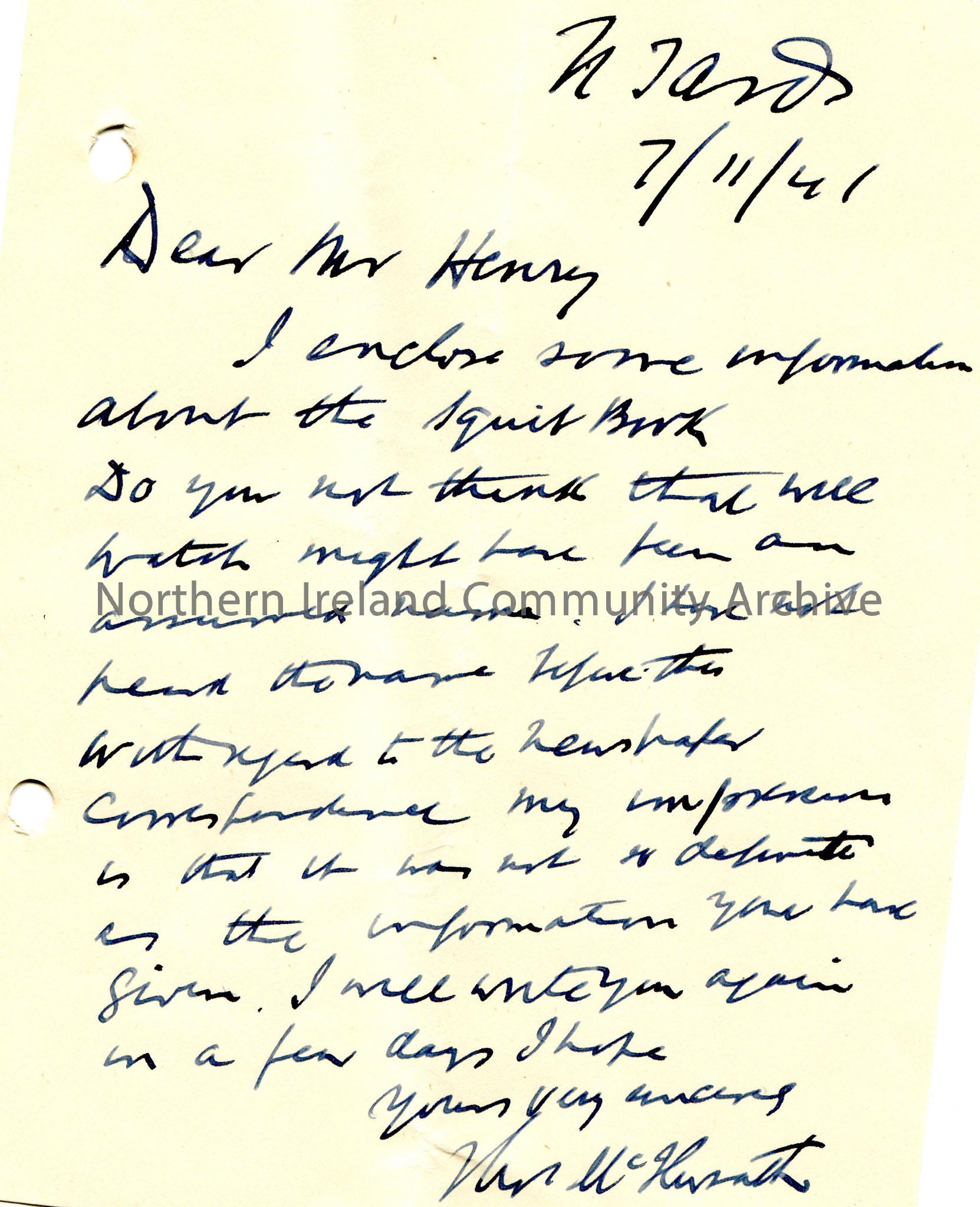 Handwritten letter to Sam Henry. Writing re the name Will Watch.