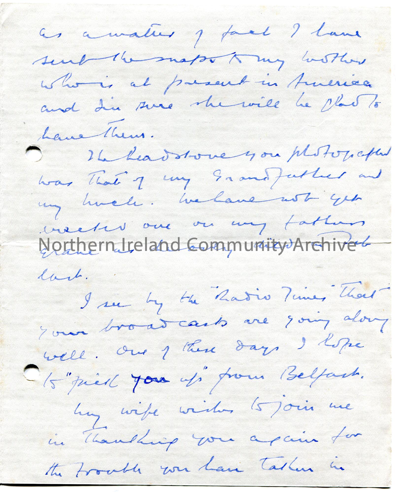 Handwritten letter to Sam Henry (written on three sides). Thanks Sam for going to Claudy and taking photographs and has sent them on to his brother in… – scan010b