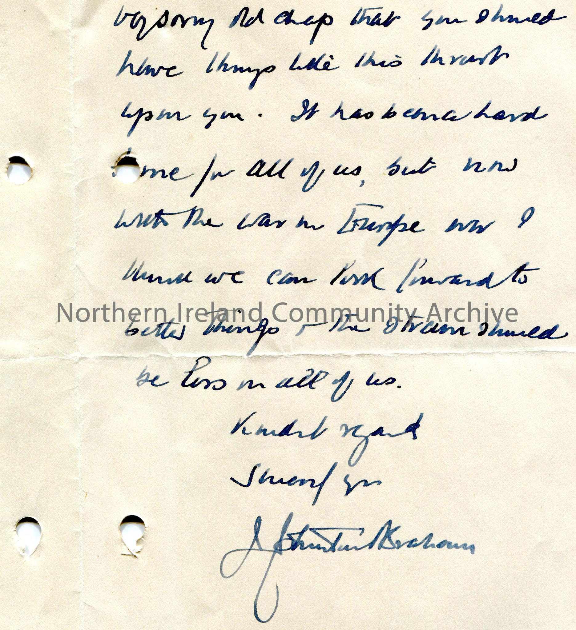 Handwritten letter to Sam Henry. Written two sides of a folded page. He is sorry that Sam is under the weather. Will write to Shannon? It is his silver wedding anniversary. He may make suggestions if they are helpful. He is sorry 'things like this' have been 'thrust upon' Sam. Writes that the war in Europe hasn't helped but now it is over looks forward to 'better things'.