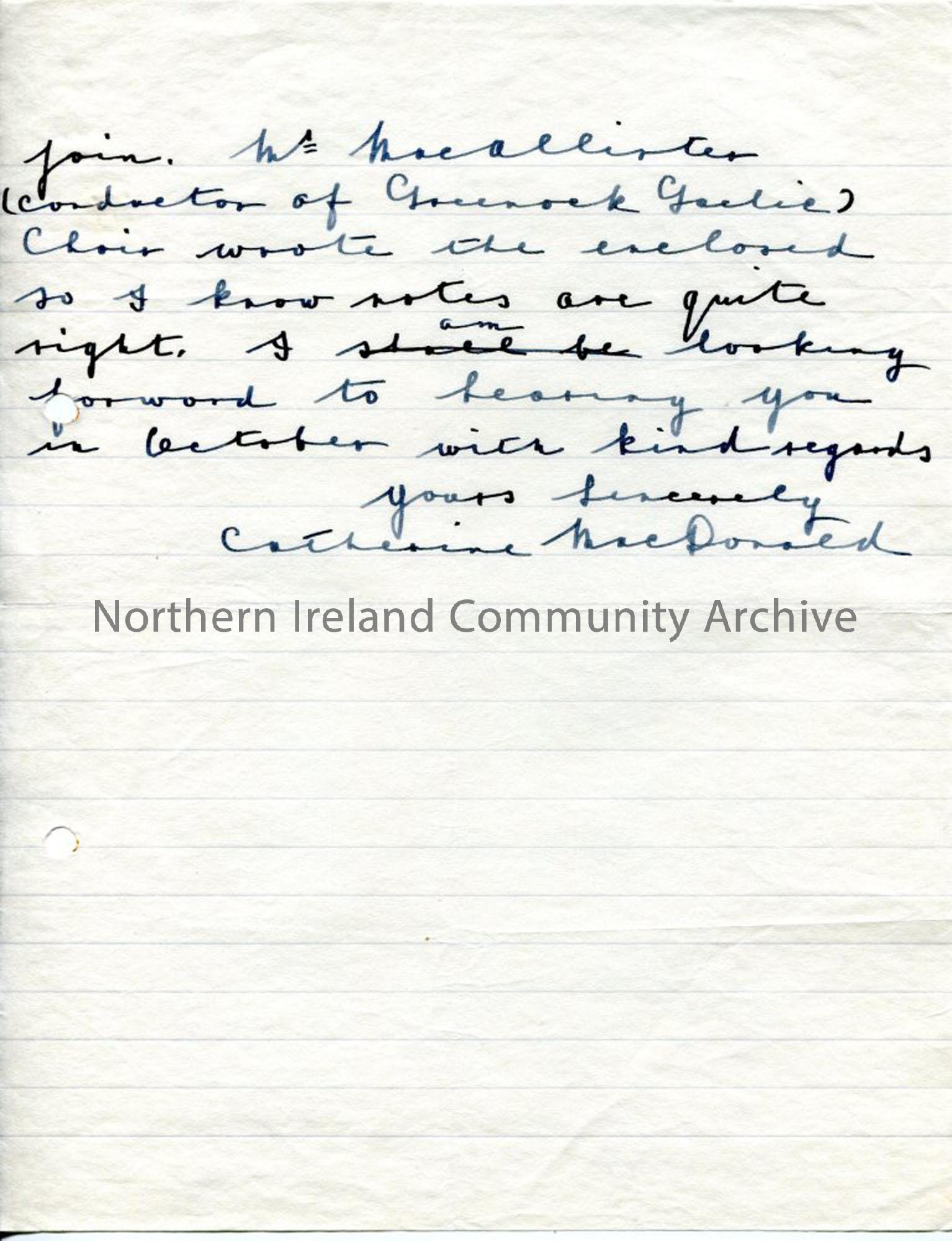 Handwritten letter - 2 songs which 'I have often heard being sung to the seals' sent for broadcast. Songs obtained from fisherman's wife on Jura. [songs not in letter] Author MacDonald, Catherine.