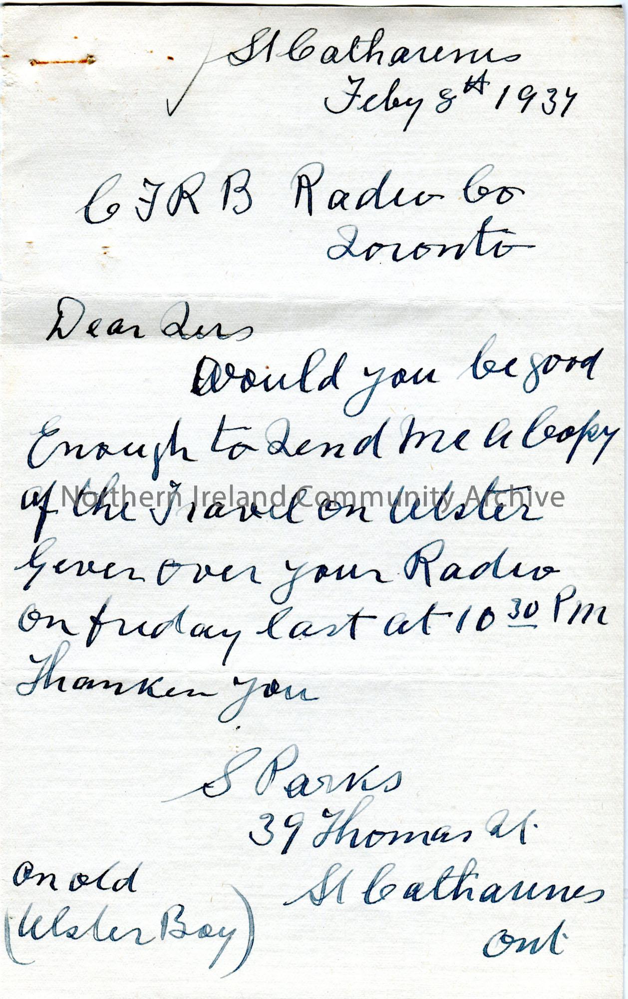 Handwritten letter to Station C.F.R.B, Canada from S. Parks 'an old Ulster Boy'. Requests a copy of the travel talk on Ulster given in February 1937.