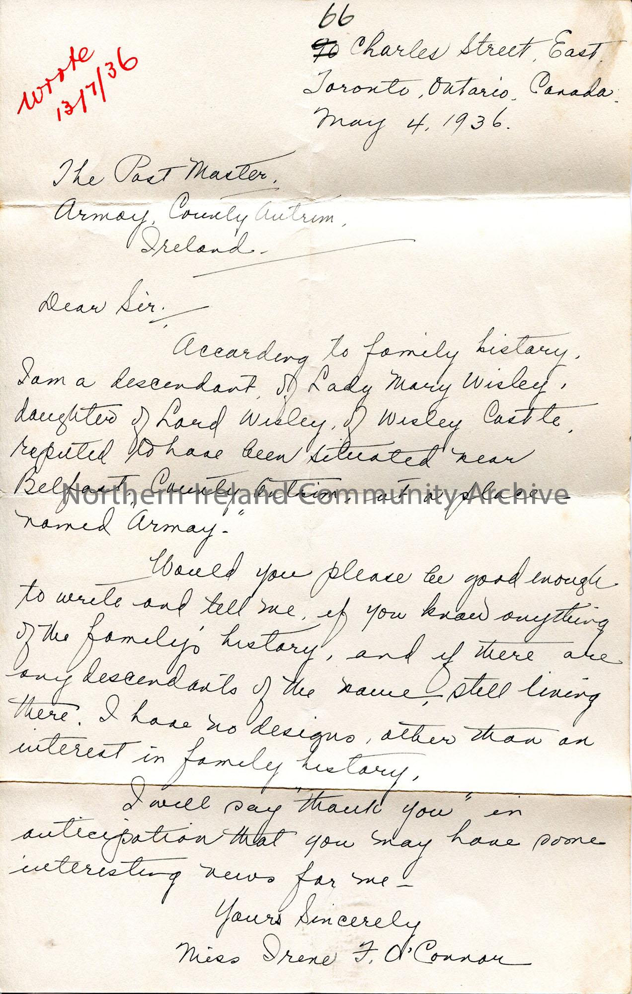 Handwritten letter to the Post Master at Armoy from Miss Irene F O'Connor. Letter most likely passed to Sam Henry for investigation. She is a descendant of Lady Mary Wisley, daughter of Lord Wisley of Wisley Castle, Armoy and would like more information on her family tree.