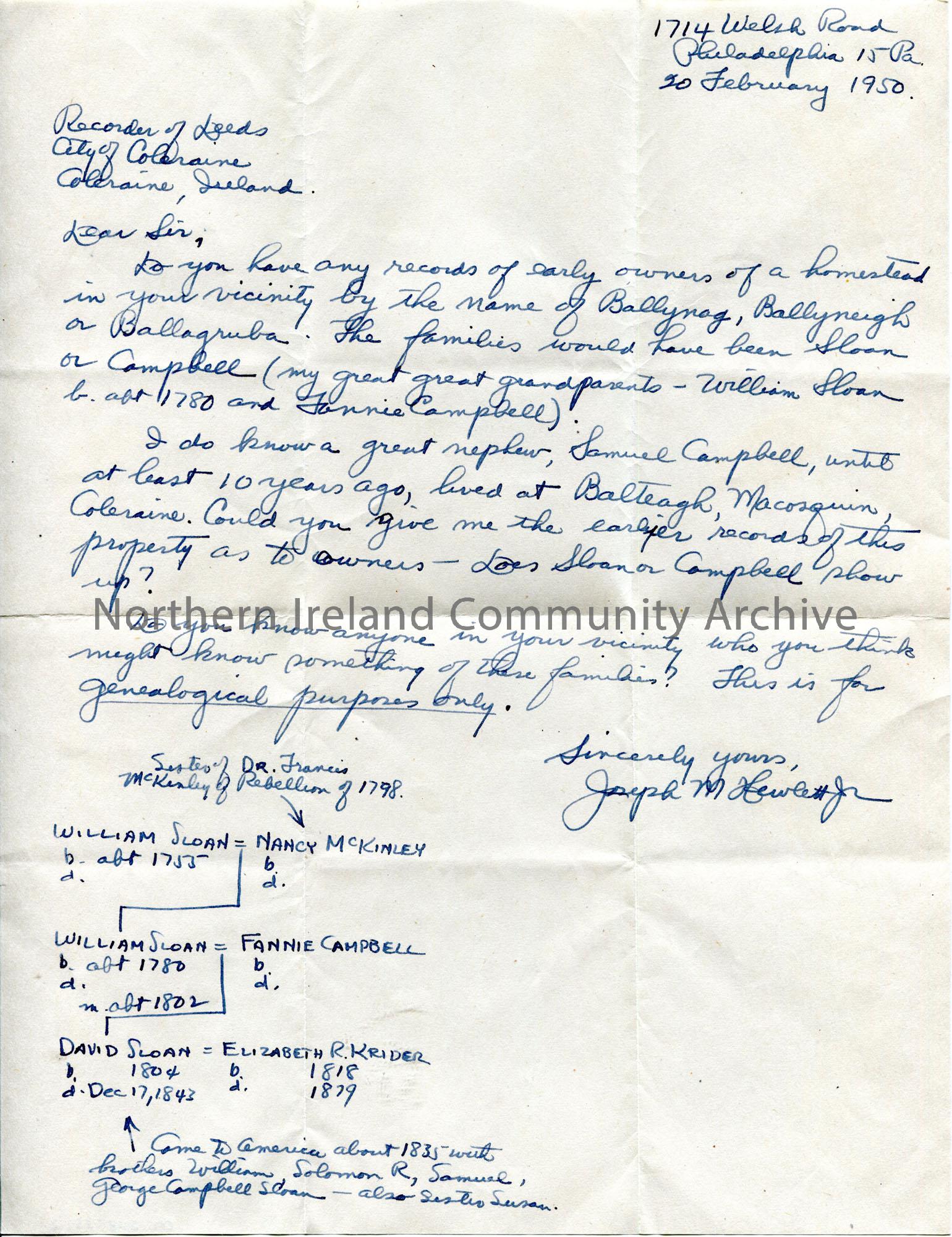 Handwritten letter to the Recorder of Deeds. Requesting information re places Ballynog, Ballyneigh or Ballagruba and the family names Sloan and Campbell. Also enquires about a great nephew, Samuel Campbell of Balteagh, Macosquin, Coleraine. Diagram of part of Sloan family tree dating from 1755.