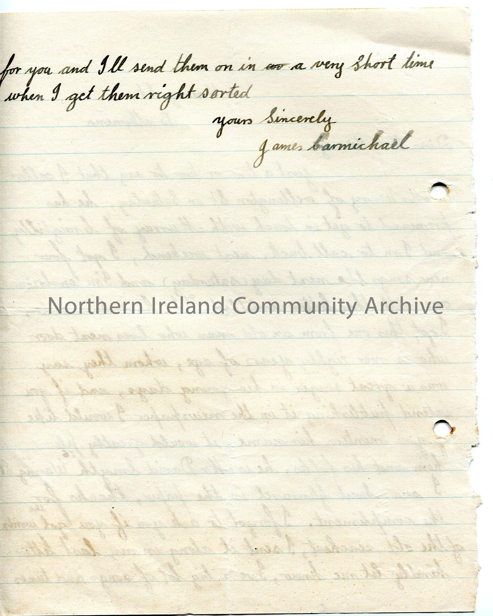 Handwritten letter updating Sam on collecting of songs, with extra note on song collected from old neighbour, and asking if Sam obtained words to song… – img897