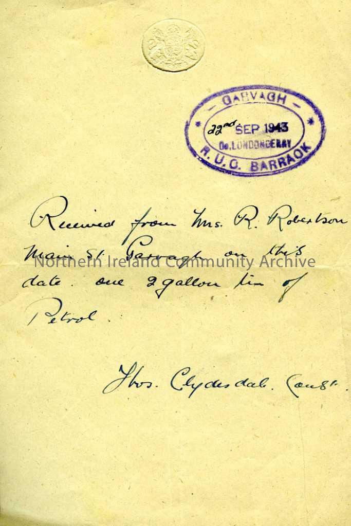 Handwritten letter - which reads 'Received from Mrs R.Robertson, Main St Garvagh on this date (22.9.1943). One 2 gallon tin of petrol. Stamped by Garvagh R.U.C Barrack and signed Thos Clydesdale ?