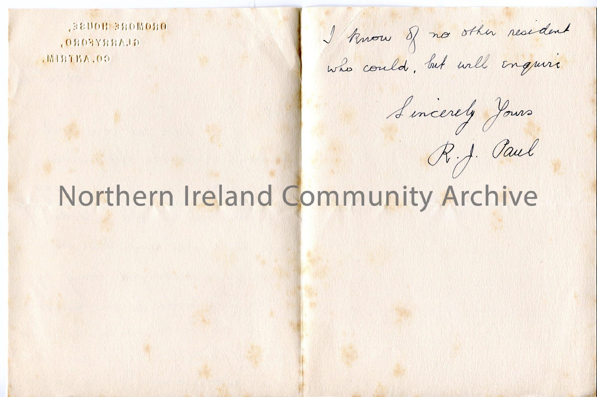 Handwritten letter with embossed address – folded and 2 sides used. Relating to records of Killymurris graveyard – no old records available. – img859