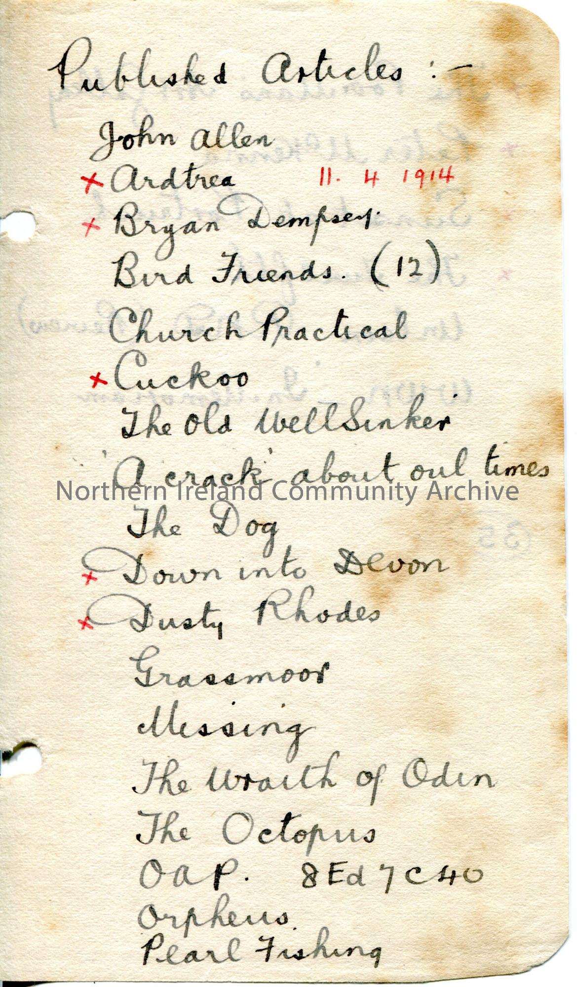 Handwritten list (double sided) of 35 published articles by Sam Henry. Begins 'John Allen, Ardtrea, Bryan Dempsey, Bird Friends, Church Practical, Cuckoo, The Old Well Sinker, A crack about oul times, The Dog, Down into Devon, Dusty Rhodes, Grassmoor, Missing, The Wraith of Oden, The Octopus, OAP, Orpheus, Pearl Fishing, The Poor Man's Art Gallery, Peter McKenna, Sunset at Portrush, The Twelfth, Wilson RND, WWN - In Memoriam'.