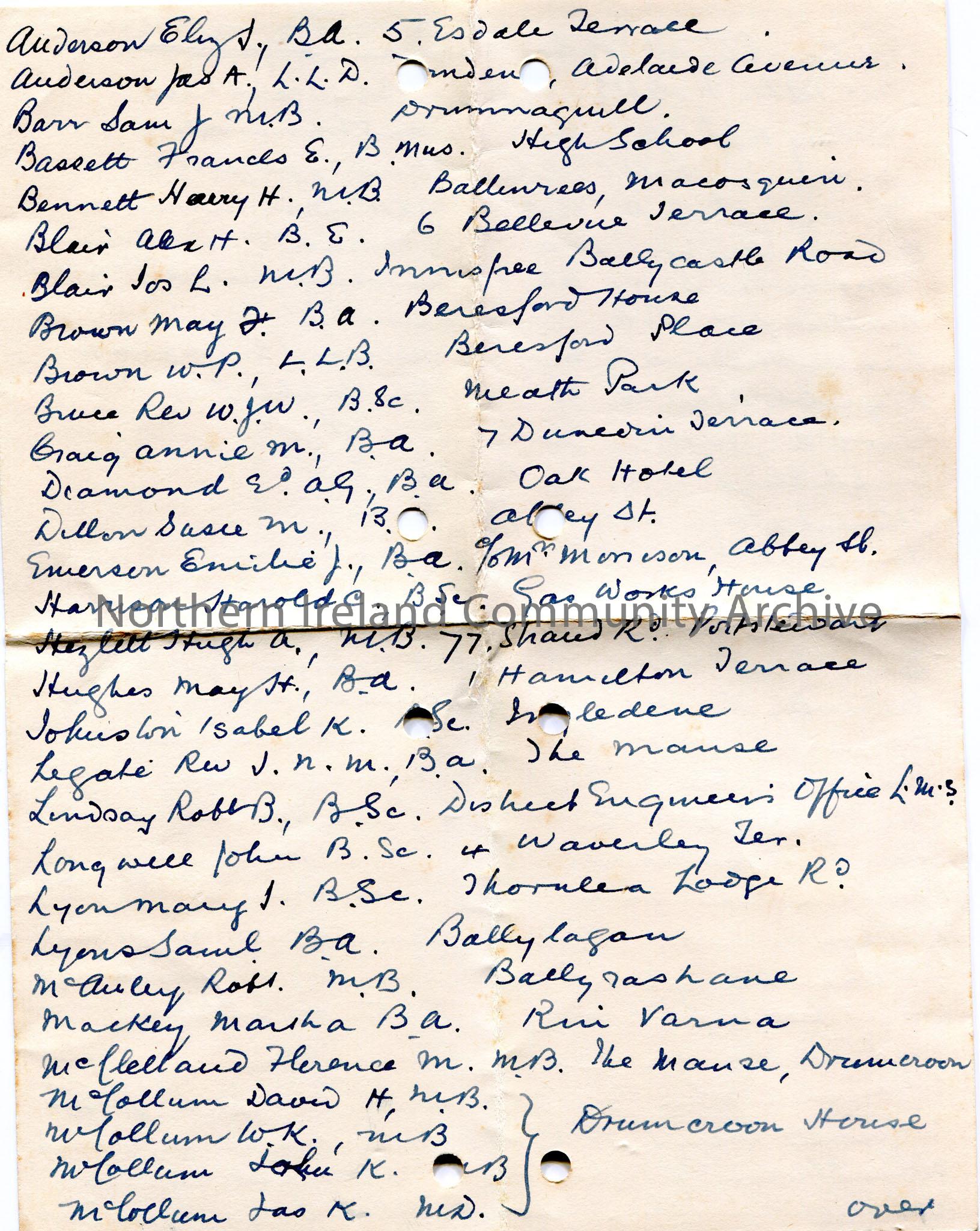 Handwritten list (double sided) of alphabetised names (first names and surnames) including their post-nominal titles and addresses - mainly of street names in Portrush and Portstewart. Mentions Portstewart, Ballyrashane, Portrush, Ballymagarry