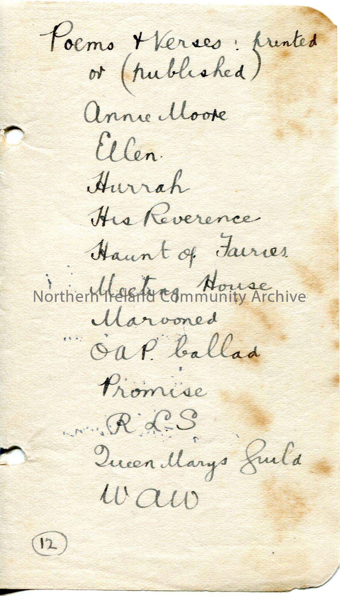 Handwritten list of 12 poems and verses printed or published by Sam Henry. Includes Annie Moore, Ellen, Hurrah, His Reverence, Haunt of Fairies, Meeting House, Marooned, OAP Ballad, Promise, RLS, Queen Mary's Guild, WAW.