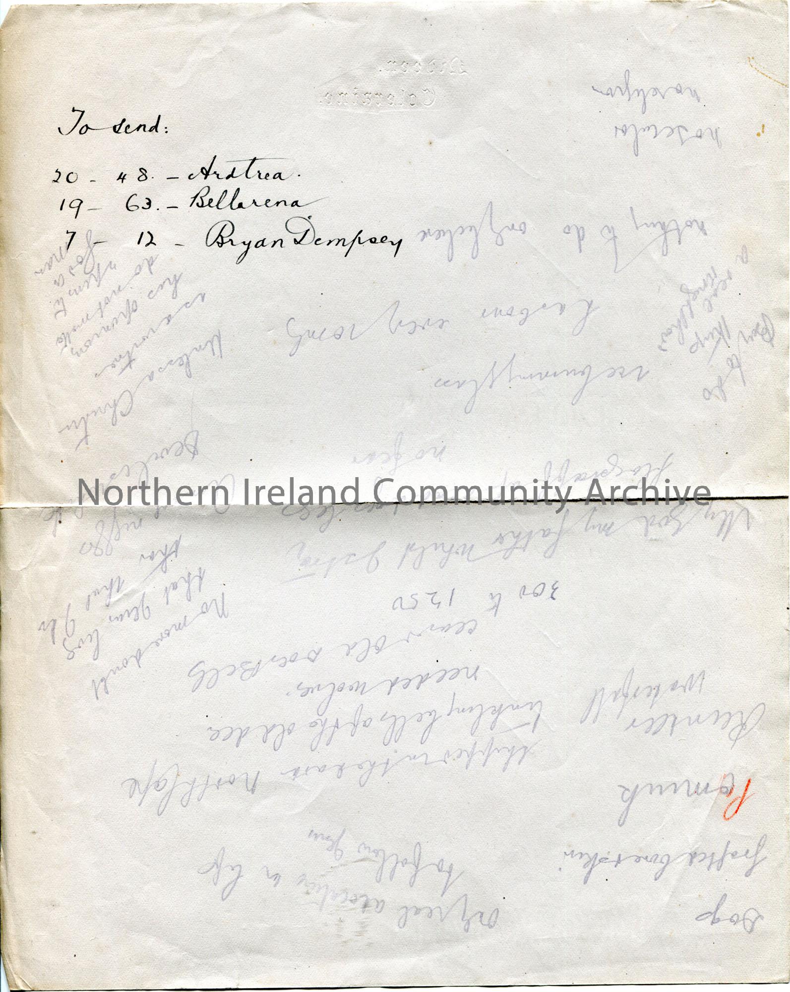 Handwritten list of articles/poems/songs by Sam Henry as well as a list titled, 'Nature Notes'. Page embossed with Sam's address of Nideen Coleraine. Rough notes in pencil, not in context, on reverse.