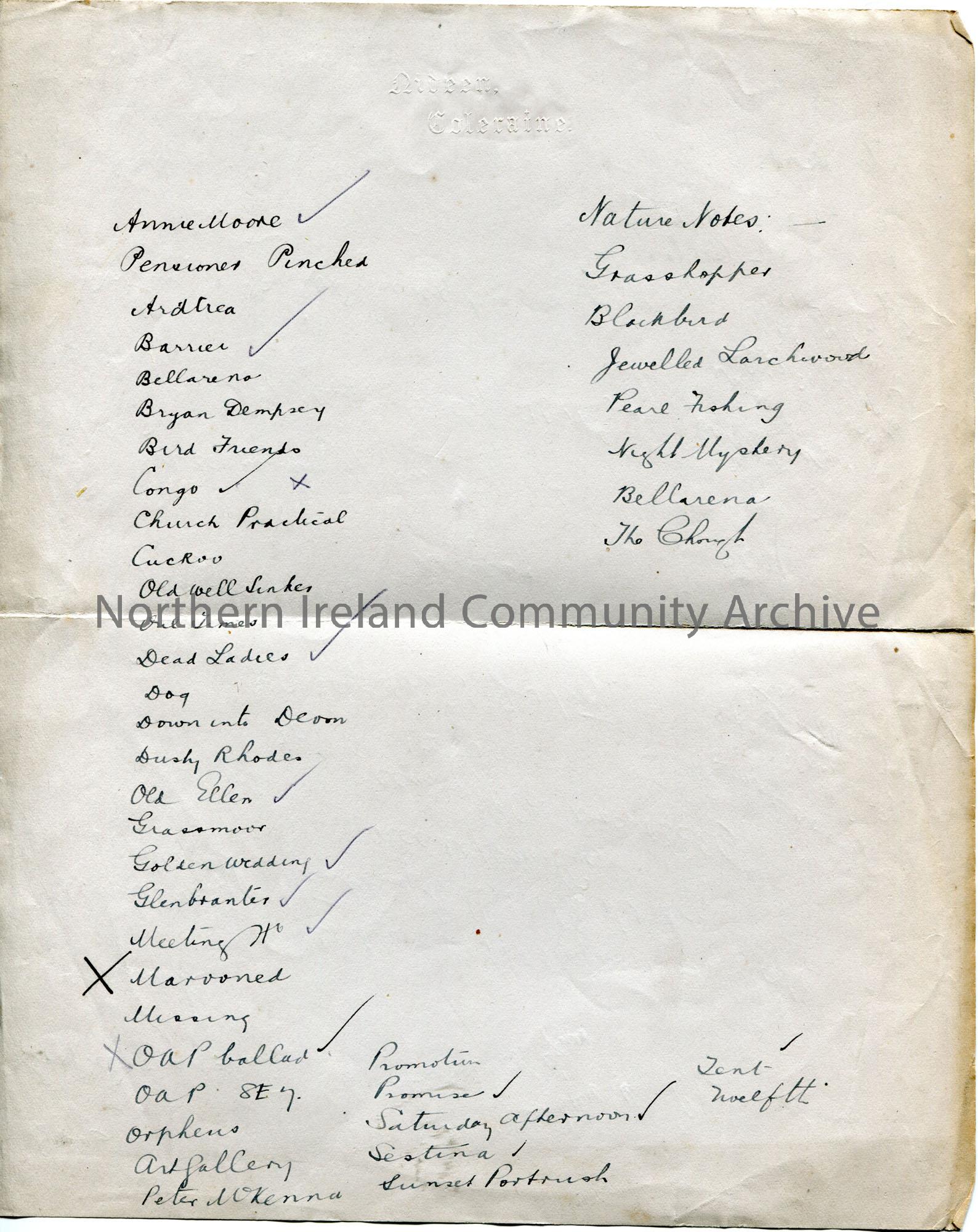 Handwritten list of articles/poems/songs by Sam Henry as well as a list titled, ‘Nature Notes’. Page embossed with Sam’s address of Nideen Coleraine. …