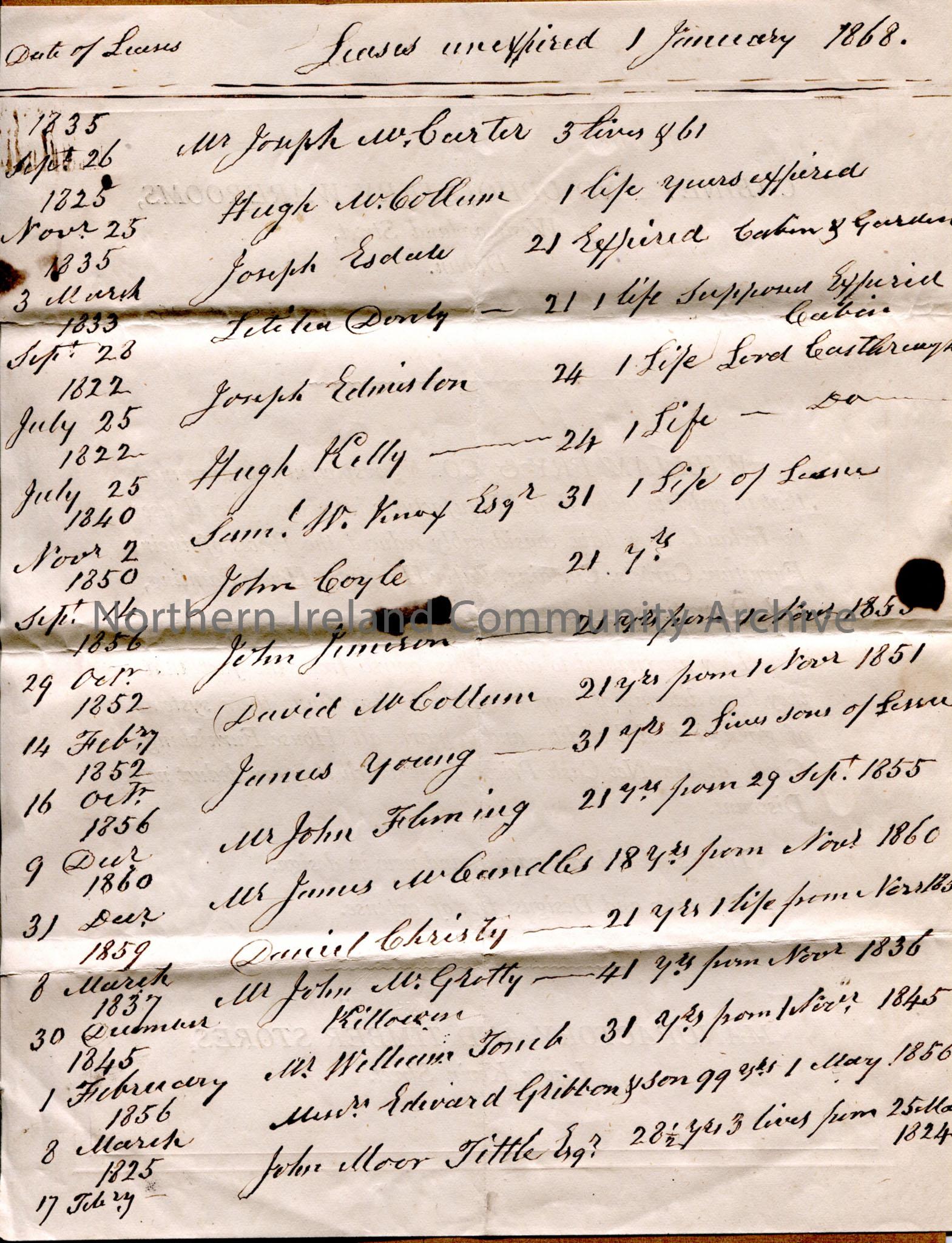 Handwritten list of leases unexpired on 1 January 1868, with names of tenants and original lease date and agreement details - e.g. Edward Gribbon, Daniel Christy, John McGrotty of Killowen. Written on back of flyer for William Fry and Co., Cabinet and Upholstery Warerooms in Dublin